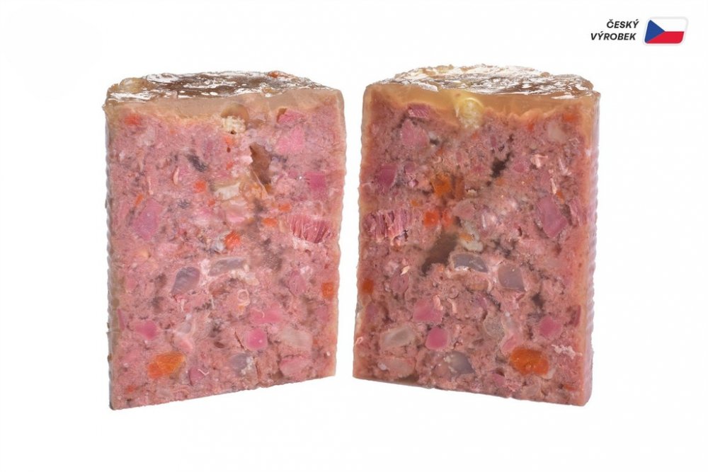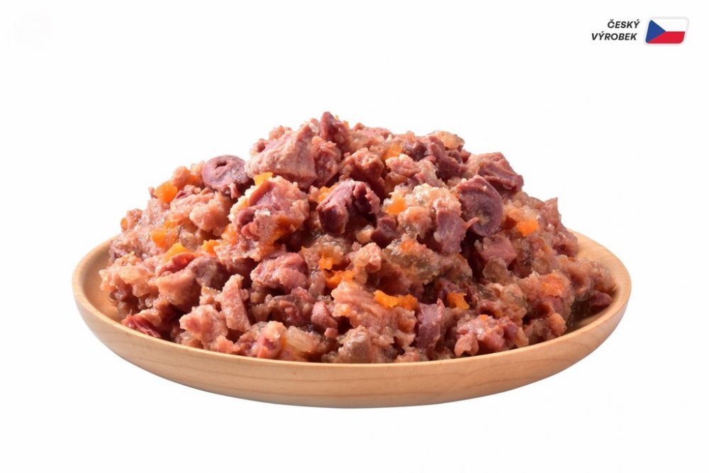 Sam's Field True Chicken & Veal Meat with Carrot for Puppies. Superprémiová masová konzerva pro štěňata s vysokým obsahem 66 % pravého kuřecího a telecího masa, s mrkví. S kousky masa z vnitřností. Vysoce kvalitní potrava, žádné obiloviny, pravé maso. Bez obsahu obilovin, sóji, bez konzervačních látek a barviv. Složení: 46 % kuřecího, 20 % telecího, 4 % mrkev, 2 % hrachová mouka, 1 % lignocelulóza, 0,5 % lososový olej, 26,5 % vývar. Analytické složky: vlhkost 78 %, hrubý protein 9 %, obsah tuku 6 %, hrubý popel 3 %, hrubá vláknina 0,5 %, vápník 0,2 %, fosfor 0,3 %, sodík 0,25 %. Nutriční doplňkové látky v 1 kg: vitamin D3 (3a671) 250 m.j., vitamín E (3a700) 120 mg, zinek (3b606) 15 mg, mangan (3b504) 4 mg, jód (3b201) 0,8 mg, měď (3b406) 5 mg, železo (3b106) 12 mg. Technologické doplňkové látky v 1 kg: Karubin (E410) 5 000 mg. Metabolizovatelná energie: 1 030 kcal/kg. Krmný návod: podávejte při pokojové teplotě. Po otevření uchovávejte v lednici. Dávkování se může lišit podle plemene psa, sezónních faktorů a musí být rozděleno na dvě denní jídla. Musí být podávána čerstvá voda. Není určeno k lidské spotřebě. Datum minimální trvanlivosti, registrační číslo výrobce a šarže uvedeno na spodní straně konzervy. Krmivo vyrobené v České republice.