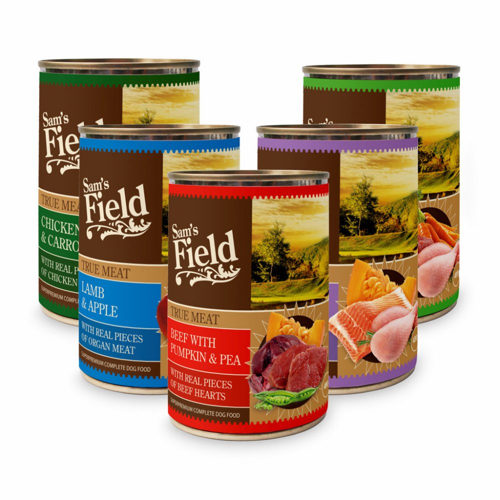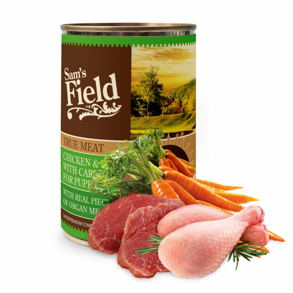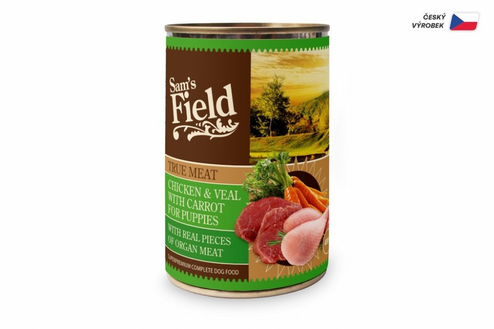 Sam's Field True Chicken & Veal Meat with Carrot for Puppies. Superprémiová masová konzerva pro štěňata s vysokým obsahem 66 % pravého kuřecího a telecího masa, s mrkví. S kousky masa z vnitřností. Vysoce kvalitní potrava, žádné obiloviny, pravé maso. Bez obsahu obilovin, sóji, bez konzervačních látek a barviv. Složení: 46 % kuřecího, 20 % telecího, 4 % mrkev, 2 % hrachová mouka, 1 % lignocelulóza...