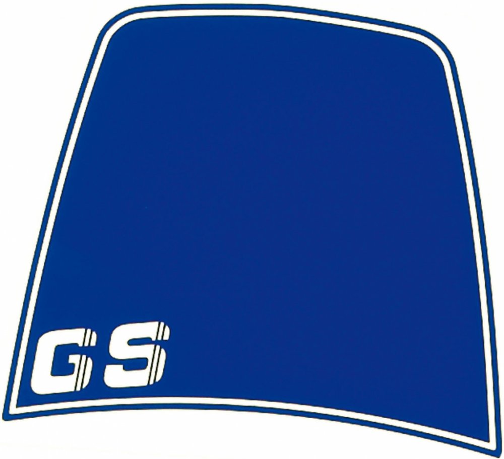Samolepka "GS" na přední plastový štít, vyřezaná z modré fólie.