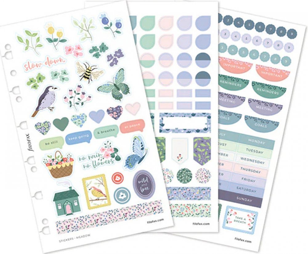 Tato nádherná sada samolepek z kolekce Meadow přinese kousek přírody do vašeho domova a pomůže vám naplánovat si den. Samolepky jsou přemístitelné a mají matný povrch. Díky tomu na ně můžete snadno psát. Aršíky si můžete snadno vložit do vašeho diáře či Clipbooku velikosti A5 nebo Osobní, stejně tak do zápisníku Filofax Notebook A5 a A4.