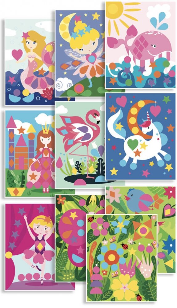 Sada obsahuje: 10 předtištěných obrázků (21 × 17 cm) k dotvoření s veselými motivy: víla, princezna, šperky, kočka, poník, jednorožec, tanečnice, květina, delfín, mořská panna, 5 archů samolepek.