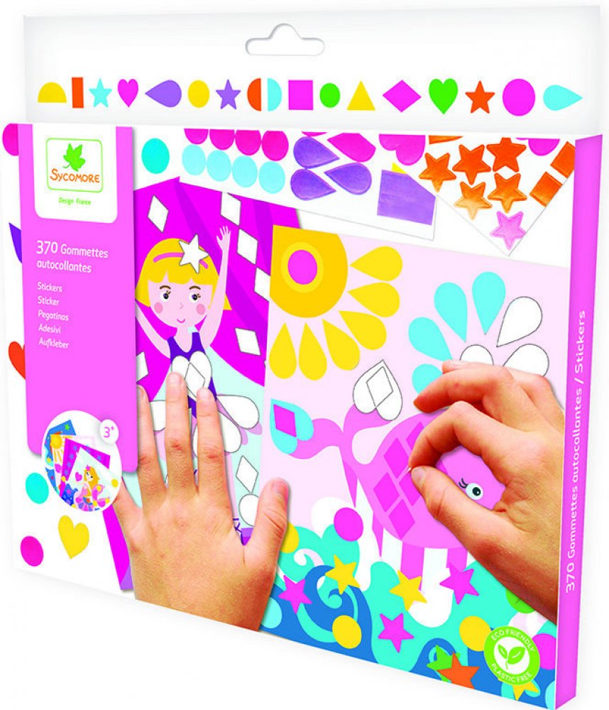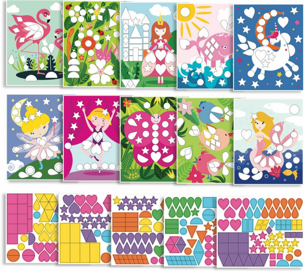 Kreativní zábava pro děti od 3 let rozvíjí jemnou motoriku a rozeznávání barev a tvarů. Děti poznávají, kam která samolepka patří a dotvářejí tak obrázky, Zároveň si přitom procvičují počítání, zrakové vnímání i prostorovou orientaci. Samolepky jsou snadno uchopitelné i pro malé dětské ruce. Sada je uložena v praktickém pouzdře, které zároveň slouží jako úložný prostor pro další tvoření.