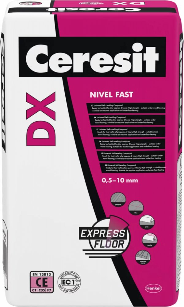 CERESIT® DX Nivel Fast je univerzální nízkoemisní cementová samonivelační hmota, určená pro vyrovnávání podkladů před pokládkou podlahových krytin a dřevěných podlah. Tato hmota je ideální pro vytváření hladkých, pevných a rovnoměrných podkladů v tloušťkách od 0,5 do 10 mm. Má vynikající zpracovatelnost a rozliv, zajišťuje vysokou pevnost a minimální pnutí. CERESIT® DX je vhodná pro použití na potěry, beton, dlažbu, deskové podlahy a staré podklady s voděodolnými zbytky lepidel. Je také vhodná pro podlahové vytápění a odolává zátěži kolečkovými židlemi.