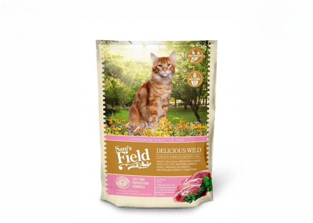 Granule Sams Field Cat Delicious Wild, superprémiové granule s divočinou 400 g (Sam's Field): 35 % kachny, rýže, 15 % čerstvě připraveného kuřete, ovoce a zelenina, kompletní krmivo pro mlsné kočky, pro vybíravé kočky, hmotnost 400 g.