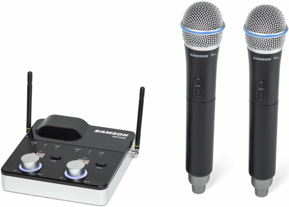 Samson Concert 288M Handheld duální bezdrátový set 2 kanálový prémiový systém UHF s profesionálními mikrofonními vložkami Q8x a moderním přijímačem s funkcí skenování okolního prostředí. Parametry přijímače AR299M: skutečná RF diverzita pro minimalizaci výpadků signálu, skenování prostředí pro výběr optimálního kanálu, nastavení kanálu pomocí IR paprsku, uzamčení zvoleného nastavení pro eliminaci ...