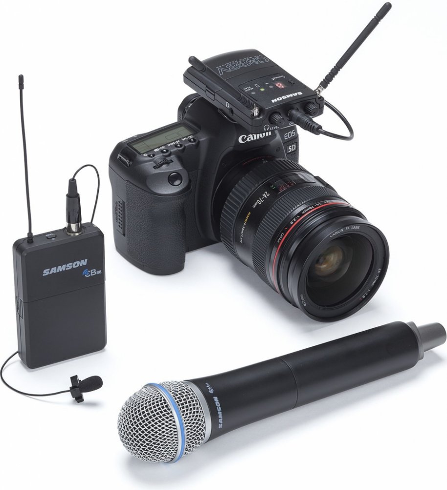 Profesionální sada bezdrátového systému zahrnující mikrofon typu lavalier, ruční mikrofon, bezdrátový přijímač a bezdrátové vysílače. Poskytuje kamerám možnost nahrávání audio a video záznamů ve vynikající kvalitě. Disponuje výběrem 16 frekvenci sloužících pro bezproblémový provoz sady, a primontovatelný přijímač na kameru napájen pomocí odnímatelné dobíjecí lithium/ion baterie, která má vydrž až 12 hodin a je součástí produktu. Do bezdrátového přijímače je signál přenášen pomocí CH88 ručního vysílače, který je napojen na mikrofon Samson Q8 s dynamickou kapslí, nebo CB88 opaskového vysílače, který je napojen na všesměrový mikrofon Samson LM10 typu Lavalier. Oba mikrofony s vysílači poskytují výdrž až 8 hodin díky dvěma AA bateriím (nejsou součástí produktu). Vysílače disponují také ovládáním Gain a tlačítkem Mute. Součástí CB88 je také kovový opaskový klip. Přijímač je kompatibilní s HD kamerovými rekordéry a DSLR kamerami, a disponuje IR synchronizací, 1/8'' výstupem s ovládáním Level, 1/8'' sluchátkovým monitorovacím výstupem s ovládáním Level a technologií Tone Key. Součástí produktu je i přenosné pouzdro.