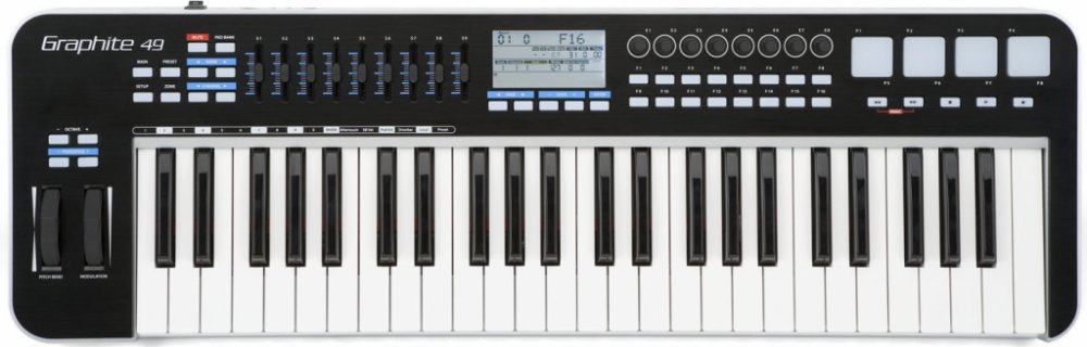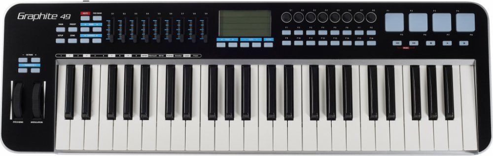 Graphite 49 je vybaven polovyváženou klaviaturou s rozsahem 49 kláves. Klávesnice je vybavena efektem aftertouch, který Vám umožní ovládat celou řadu efektů a zvukových nuancí. Klávesnice je tlakově citlivá, takže je schopná přenést každý detail dynamiky Vaší hry. Svým rozsahem plně postačuje na studiovou práci i živé hraní a přitom je velice lehká a mobilní.