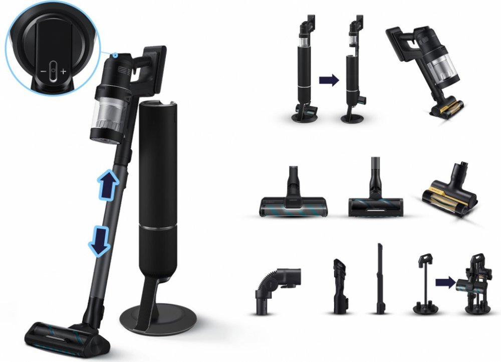 Samsung tyčové 2 l 0.5 l flexibilní ohebné černé bezsáčkové suché akumulátorové mikrofiltry 2 baterie (100/60 min) denní rychlý úklid 87 dB 730 W 2.79 kg 1 m 280 W běžný byt (2-3 pokoje) snadné (2.5-4kg nebo lehký síťový) nevhodný (>78dB) zachytí až 99,999 % nečistot speciální pro zvířata (Mini Pet Tool+ a turbo hubice) nabíjecí stanice s úložištěm Li-Ion 160 min 5 hod 2 3970 mAh minimální (bezsáčkový + omyvatelné) bezdotykové (sáčkový systém) střední (sáčkový systém) standardní kompletní sada: 5+ nástavců ovládání přes aplikaci a displej
