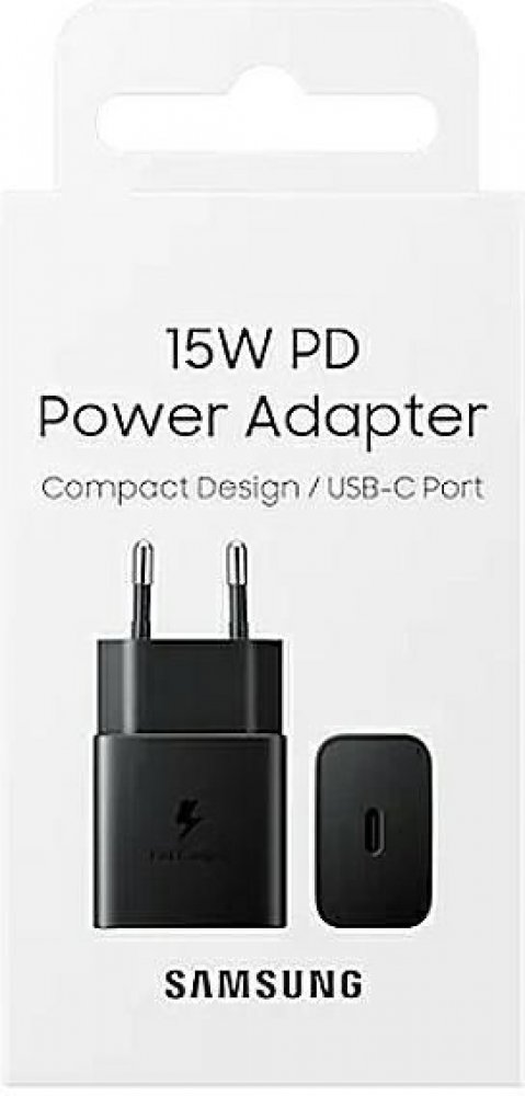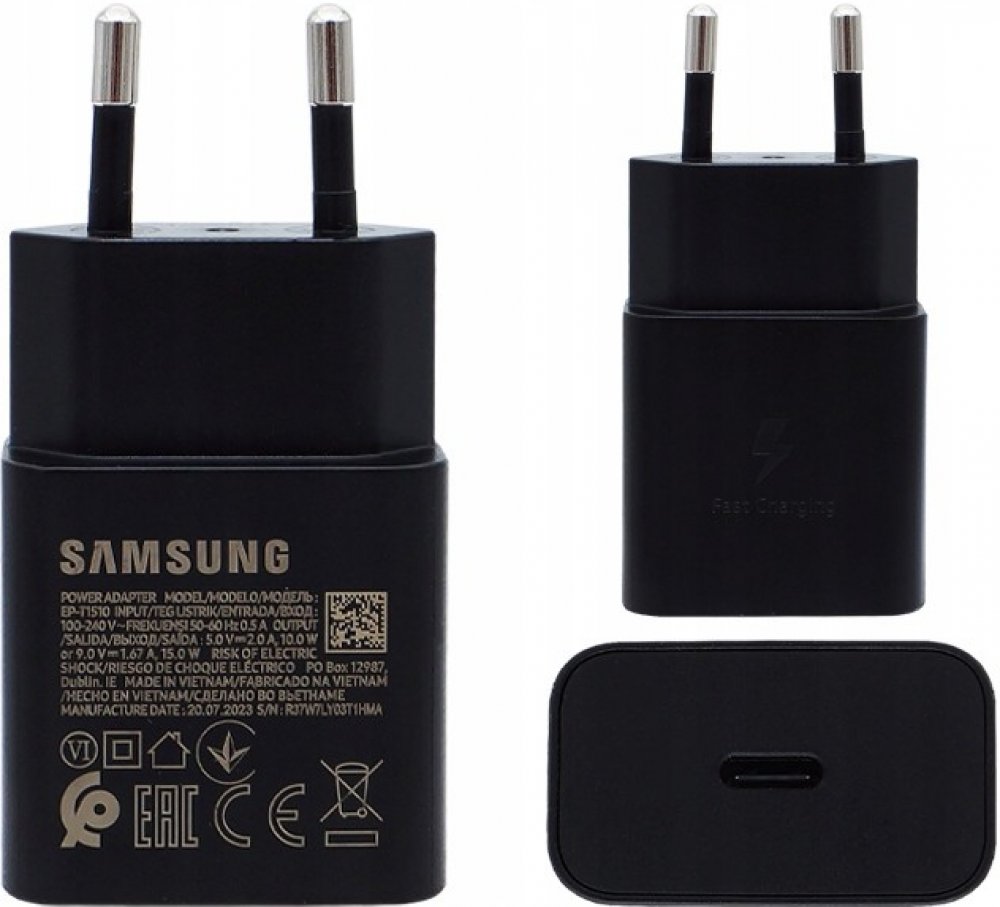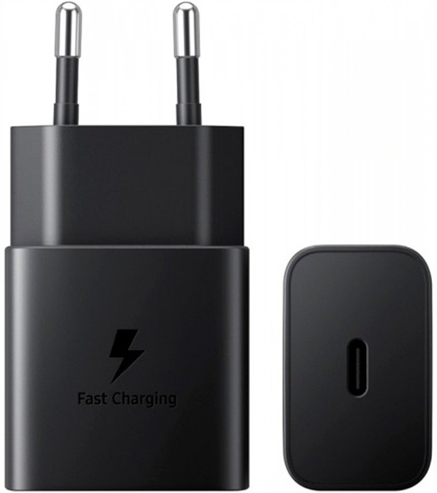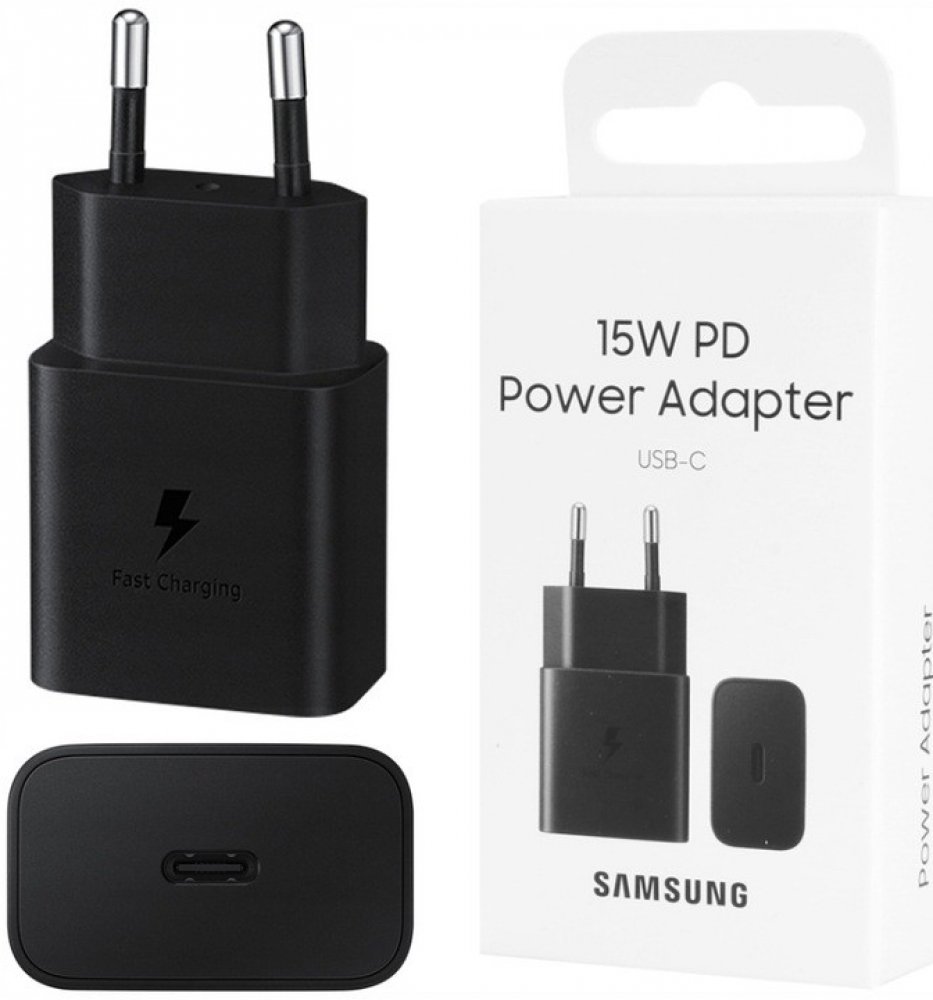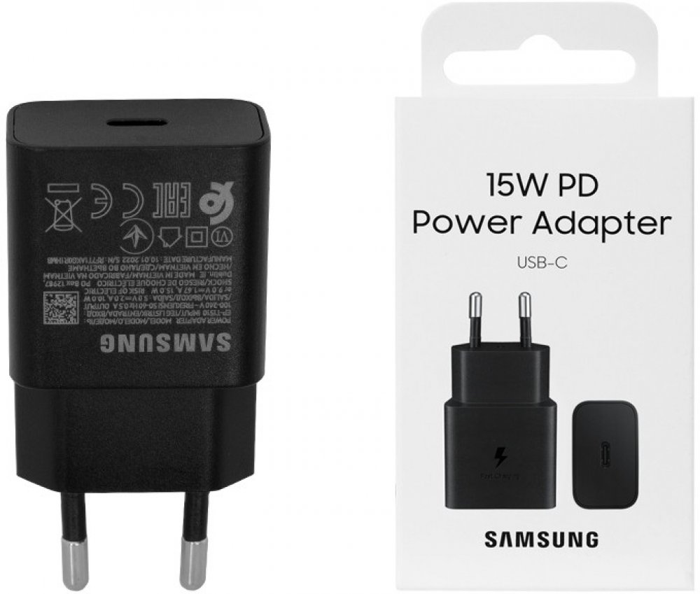 Síťová nabíječka Samsung s USB-C portem a nabízí výkon 15 W.