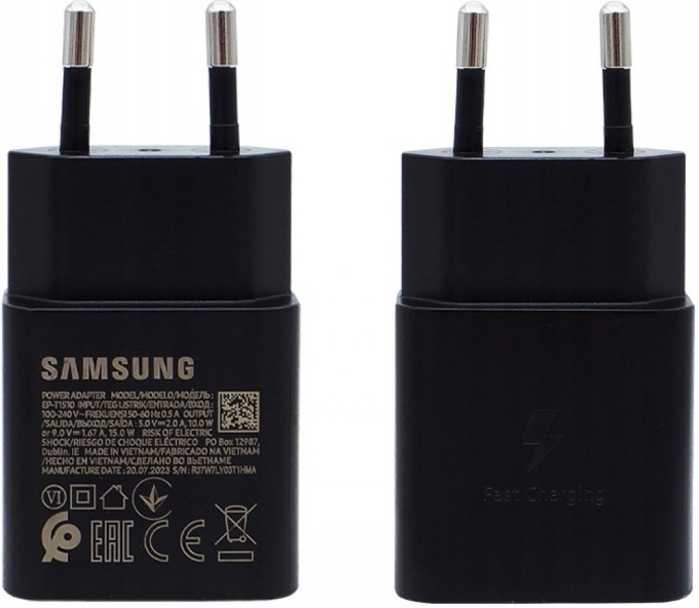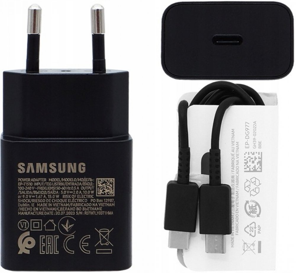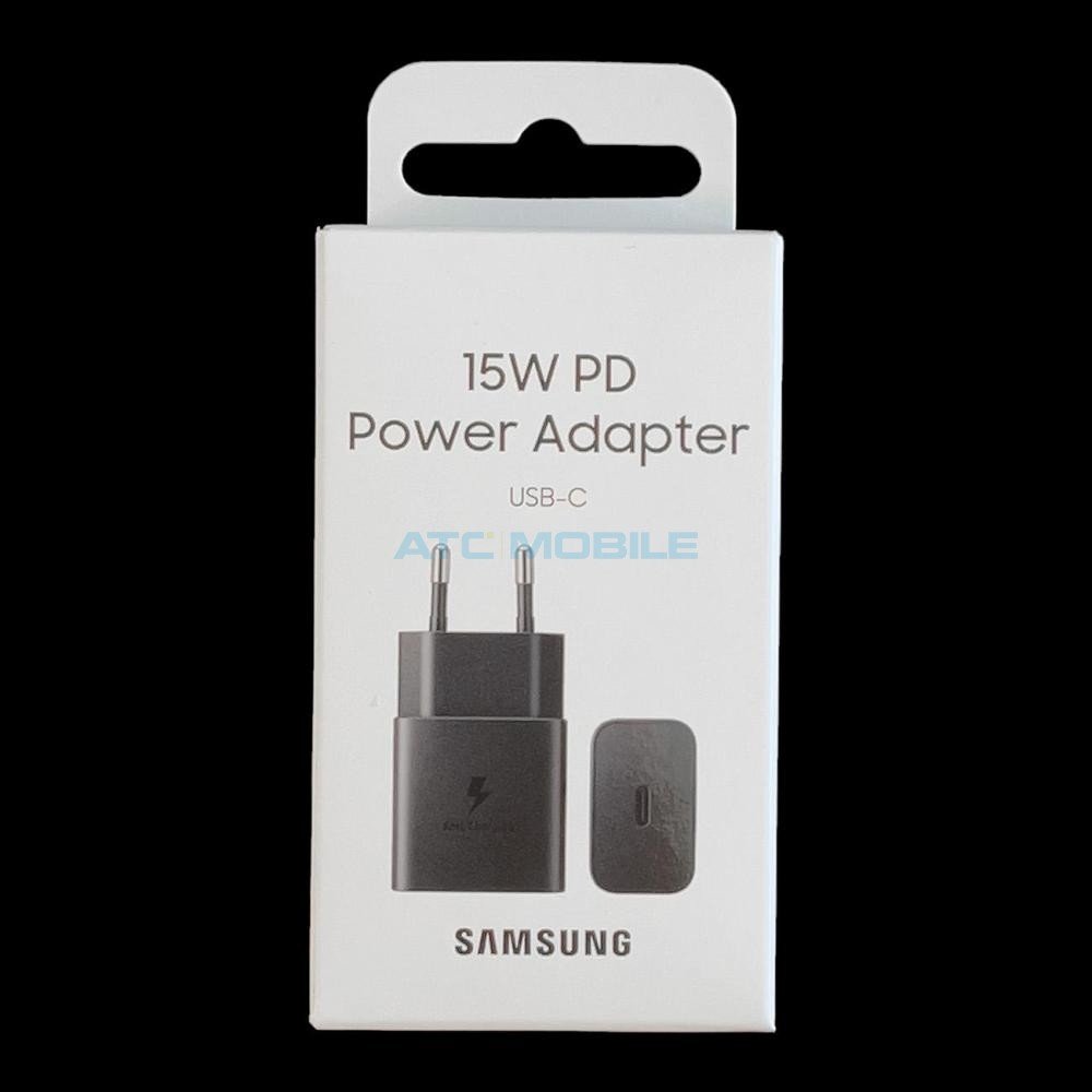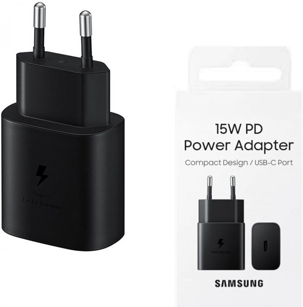Síťová nabíječka Samsung s USB-C portem a nabízí výkon 15 W.