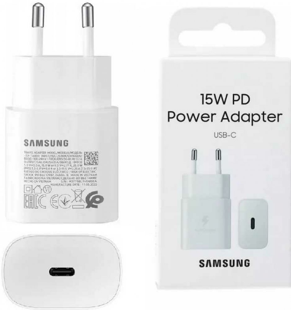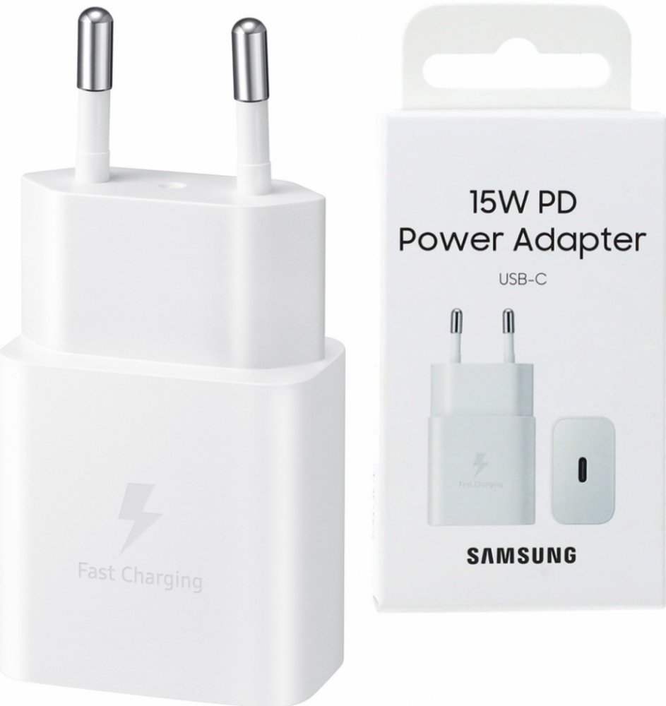 Síťová nabíječka Samsung s USB-C portem a nabízí výkon 15 W.