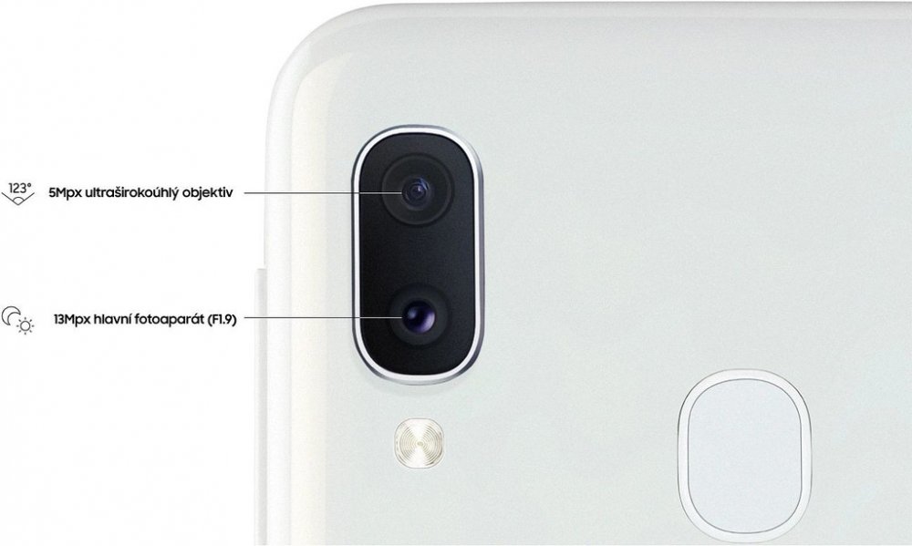 Duální fotoaparát telefonu Galaxy A20e je vybavený hlavním 13Mpx (F1.9) a ultraširokoúhlým 5Mpx fotoaparátem s 123° úhlem záběru, který zachytí všechno přesně tak, jak to vidí vaše oko.