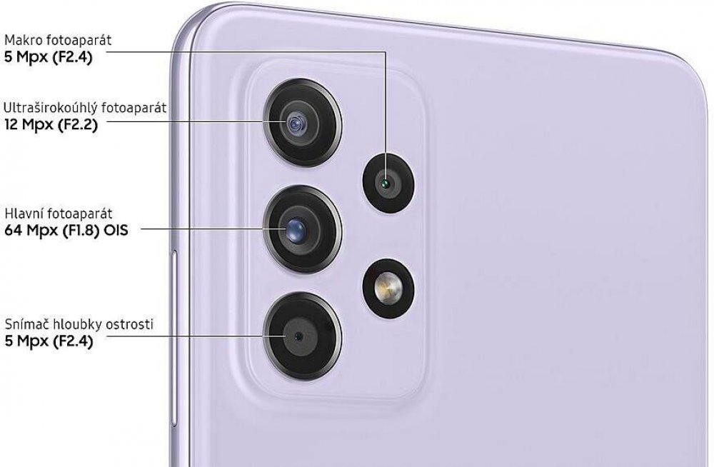 Nemusíte s sebou nosit těžký batoh s několika objektivy, abyste mohli fotit za všech okolností. Hlavní 64Mpx fotoaparát s ultra vysokým rozlišením a OIS (optická stabilizace obrazu) vám nabídne špičkové fotografie, jež budou ostré i v prudkém pohybu. Ultraširokoúhlým fotoaparátem pořídíte dechberoucí panoramata a 5Mpx makro fotoaparát vás oslní drobnými detaily. Ty ještě zvýrazní snímač hloubky ostrosti jemným bokeh efektem ? přirozeně působícím rozmazaným pozadím. Celý fotomodul perfektně splývá s minimalistickým designem Galaxy A52 5G a matnou povrchovou úpravou na zadní straně.