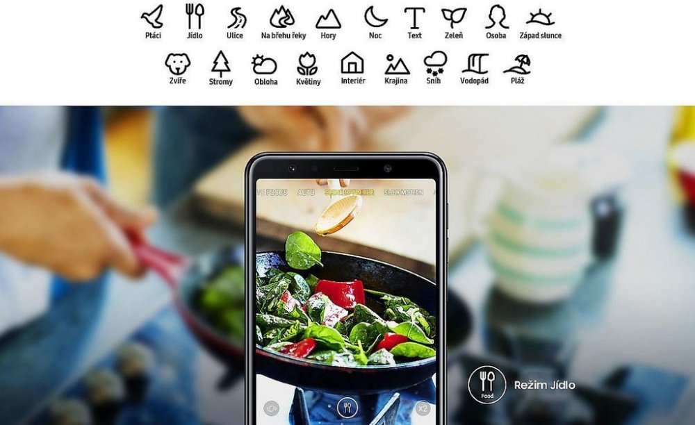Ne dva, ale rovnou tři! Galaxy A7 je vybavený trojitým fotoaparátem, s nímž získáte zcela nové možnosti. Fotoaparát je tvořen hlavním snímačem s rozlišením 24 Mpix, dále ultraširokým snímačem 8 Mpix a snímačem hloubky pole 5 Mpix, které vám poskytnou ty nejširší možnosti pro fotografování libovolné scény. Díky ultraširokému objektivu pořídíte snímky, o kterých se vám doposud ani nesnilo, a s 19 speciálními režimy bude každá fotografie perfektní.