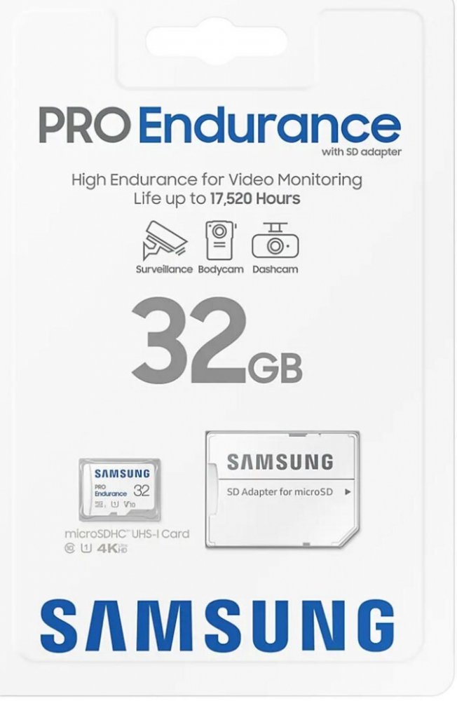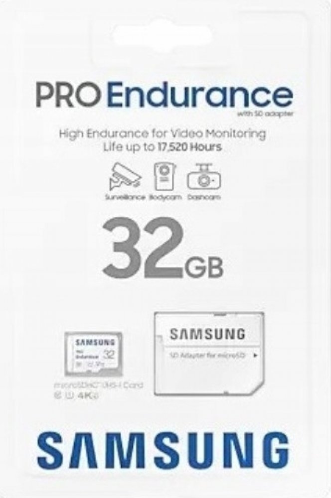 Paměťová karta Samsung Pro Endurance vás překvapí svou odolností. Dokáže pracovat téměř nepřetržitě, takže můžete nahrávat videa bez přerušení. Díky tomu je ideální mimo jiné pro sledovací kamery, sportovní kamery a videorekordéry v autě. Kapacita 32 GB stačí na uložení až 17 520 hodin videozáznamů!