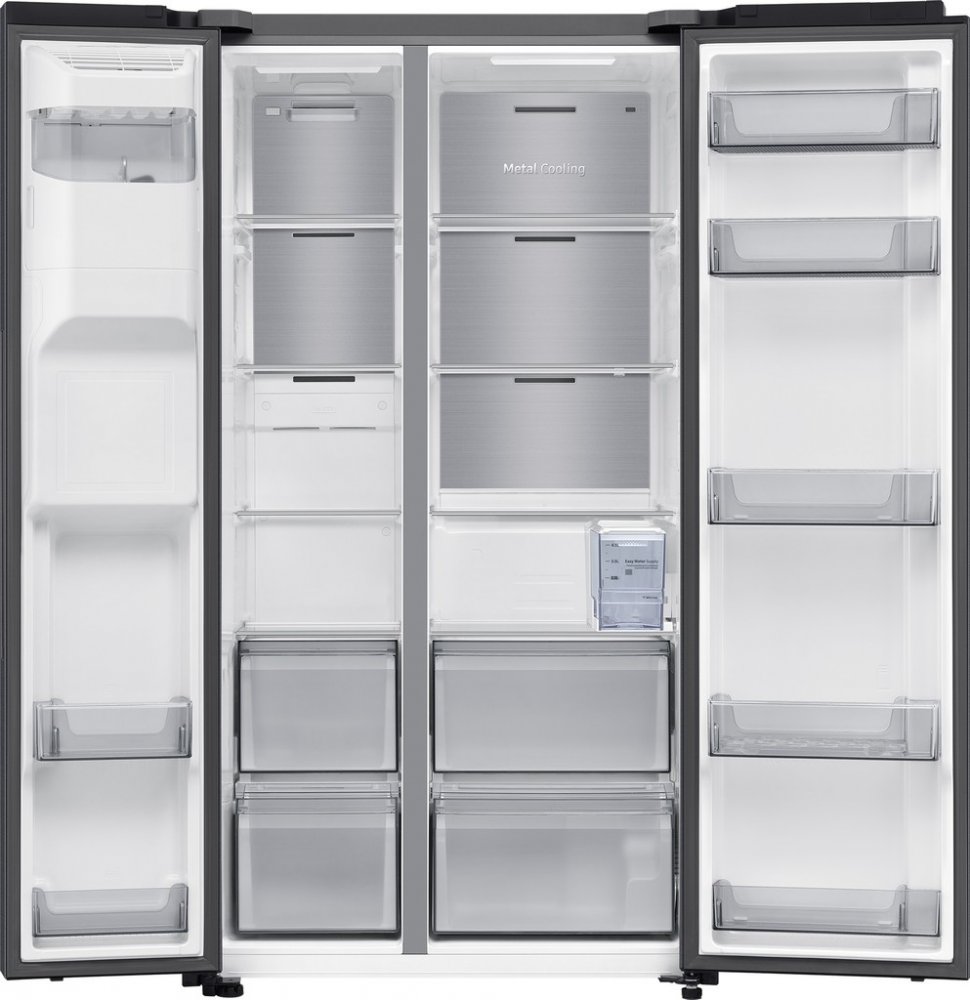 Americká lednice, dvoudveřová, objem ledničky/mrazáku 420/220 l, energetická třída E, hlučnost 36 dB, Mono Cooling, Metal Cooling, dispenzor vody a ledu, no frost, funkce rychlého chlazení a mrazení