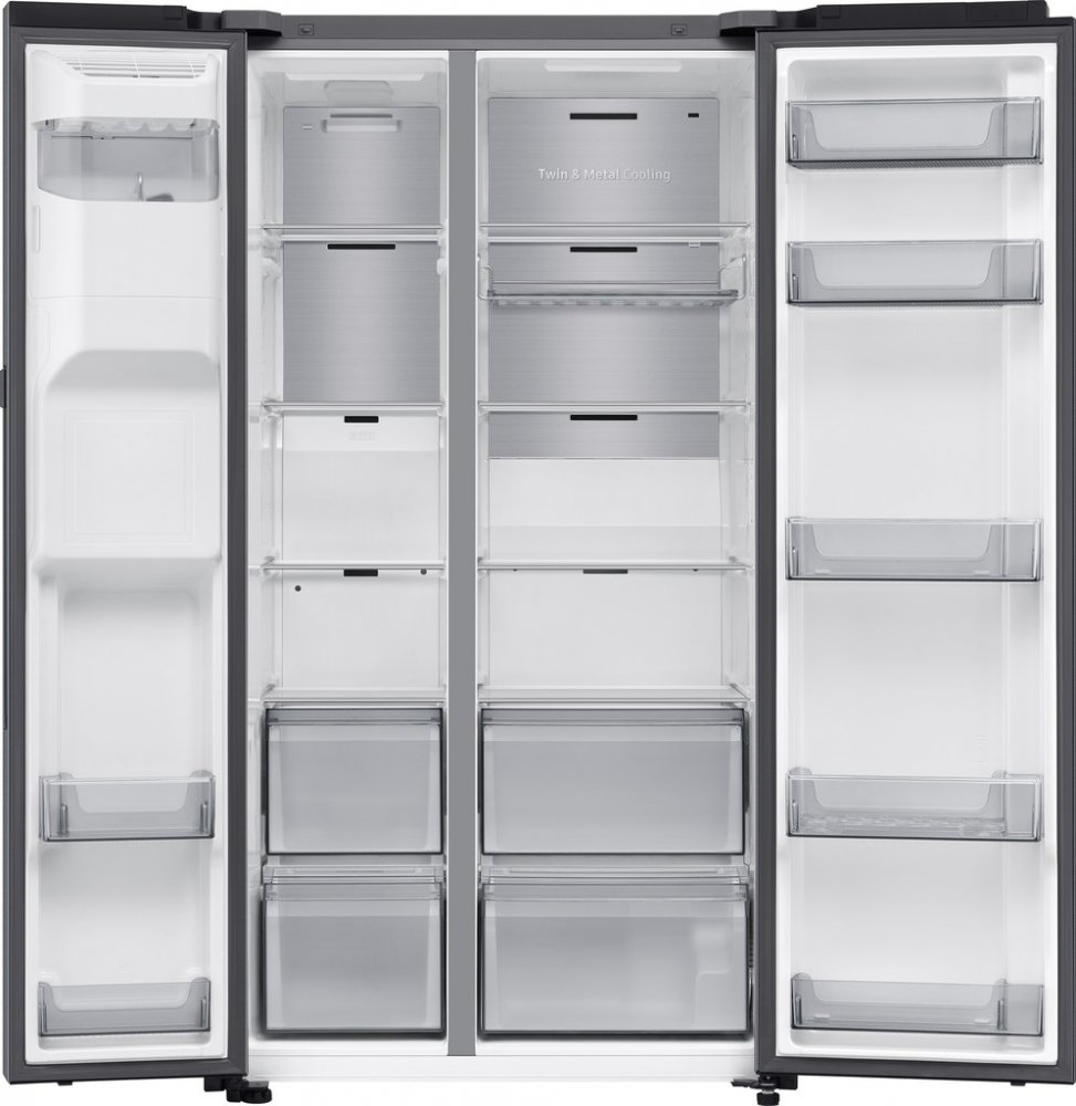 americká chladnička • výška 178,4 cm • objem chladničky 409 l / mrazničky 225 l • energetická třída B • 20 let záruka na kompresor • beznámrazová technologie No Frost • Twin Cooling Plus – 2 oddělené chladicí okruhy • Auto Open Door – otevírání dotykem • vnitřní displej • Wi-Fi, komunikace s mobilem • hlasový asistent Bixby • dávkovač vody a ledu • připojení na vodu • LED osvětlení • hlučnost 32 d...