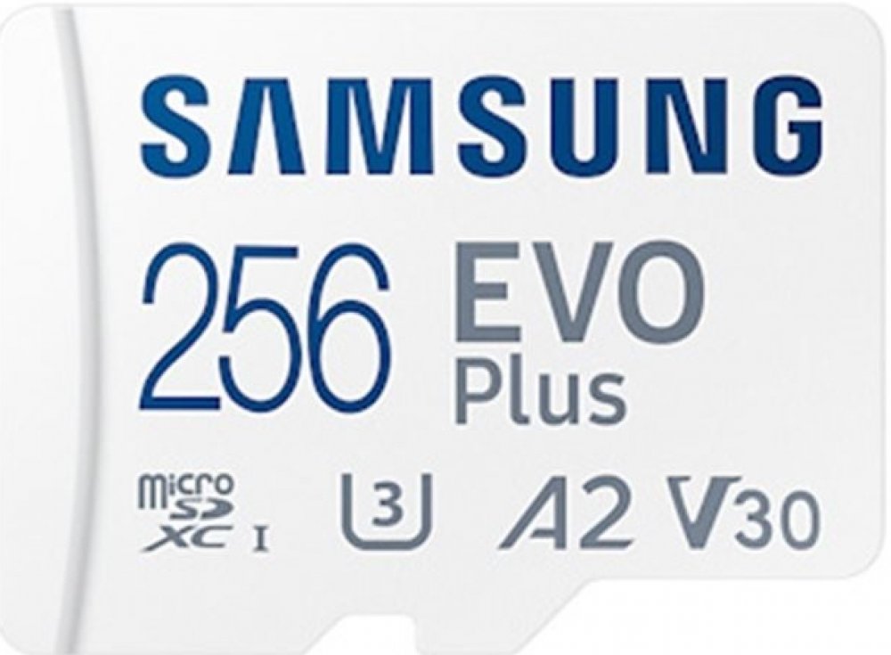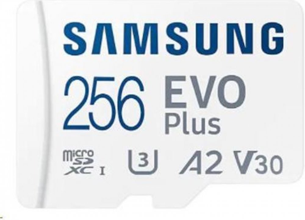 Rychlá paměťová karta Samsung EVO Plus SDXC s kapacitou 256 GB. Rychlostní třída Class 10 s UHS-I (U3), rychlost až 130 MB/s čtení a 60 MB/s zápis, SD adaptér. Voděodolné a magnetu odolné provedení. Rozměry činí 15 x 11 x 1 mm, hmotnost 0,25 g.