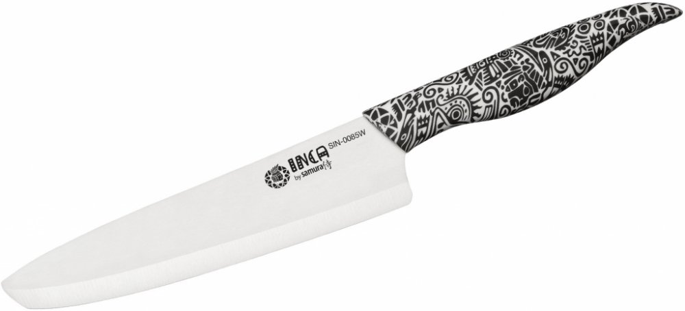 Šéfkuchařský keramický nůž Samura INCA 18,7 cm je oblíbeným kuchyňským nástrojem každého profesionálního kuchaře. Nůž má širokou a dlouhou čepel, vhodnou pro řezání velkých potravin - maso, ryby, zelí, apod. Nůž vyniká extrémně ostrým břitem o tvrdosti 87 HRC. Keramický nůž nevyžaduje broušení. Nůž zůstává ostrý po celou dobu životnosti. Motiv na rukojeti byl inspirován kulturou kmene Inků.