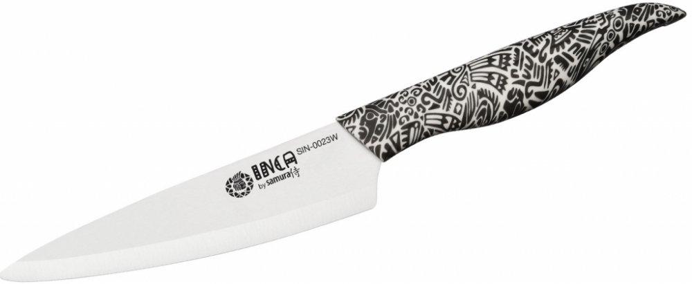 Univerzální keramický nůž Samura INCA 15,5 cm je jeden z nejoblíbenějších nožů pro každodenní vaření. Jeho funkcí je snadná manipulace a schopnost provádět více kuchyňských prací. Používá se k čištění a krájení zeleniny, ovoce, bylinek, sýrů, uzenin, masa. Největší množství kuchyňské práce padne vždy na tento nůž. Nůž vyniká extrémně ostrým břitem o tvrdosti 87 HRC. Keramický nůž nevyžaduje broušení. Nůž zůstává ostrý po celou dobu životnosti. Motiv na rukojeti byl inspirován kulturou kmene Inků.