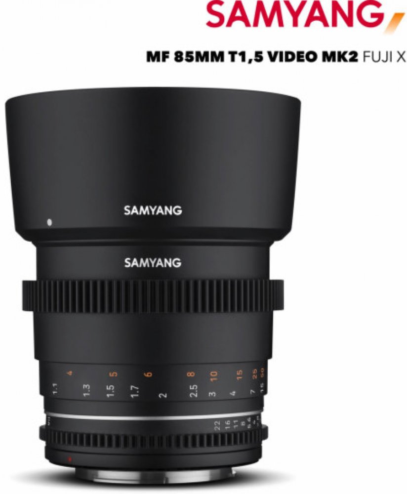 Jedná se o novinku z VDSLR MK2 řady video objektivů od společnosti Samyang. Tato aktualizovaná řada nyní přináší hned několik funkčních prvků. Široké ohnisko 85 mm a světelnost T/1.5 vám v kombinaci s vylepšenou 9 lamelovou clonou dopřejí příjemný a symetrický efekt bokeh. S nízkými clonovými čísly můžete vytvářet kreativní 18 paprskový efekt starburst. Optická soustava je tvořena 9 členy ve 7 skupinách, kde jsou zahrnuty asférické a ED členy, jež zaručují vynikající propustnost světla i vysoký kontrast. Minimální ostřící vzdálenost 109,73 cm.