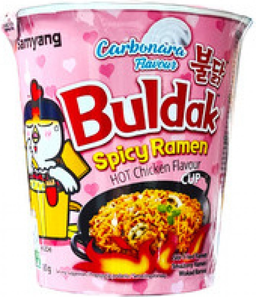 Instantní nudle Ramen značky Samyang. Varianta Buldak Hot Chicken Carbonara, tedy pálivé s kuřecí příchutí ve stylu Carbonara.