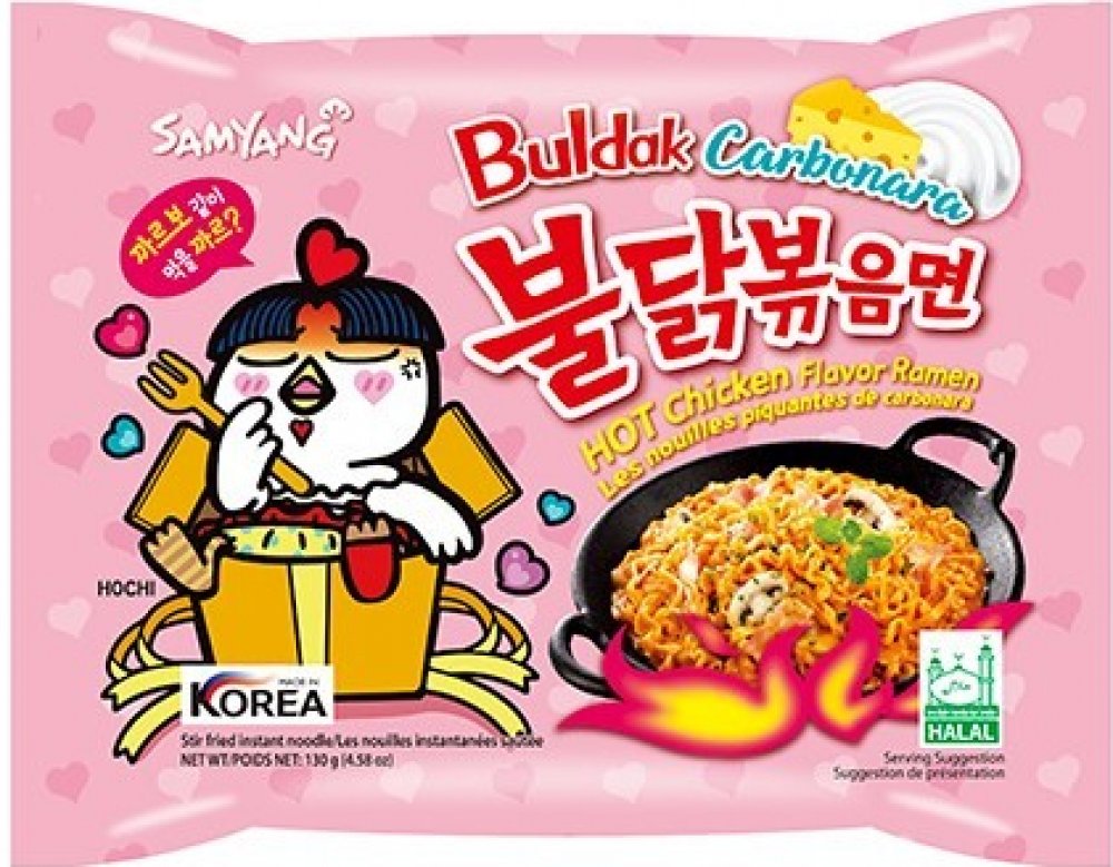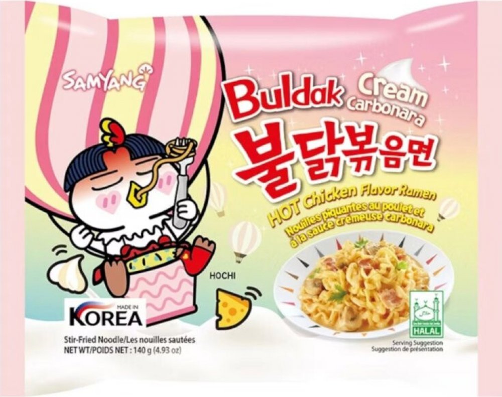 Samyang Pálivé kuřecí nudle s příchutí krémové carbonary kombinují ostrou chuť jejich charakteristické omáčky Buldak s bohatou