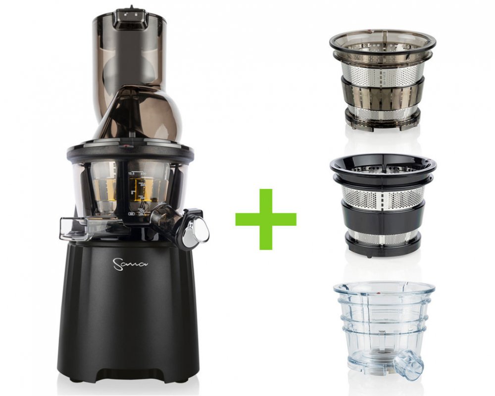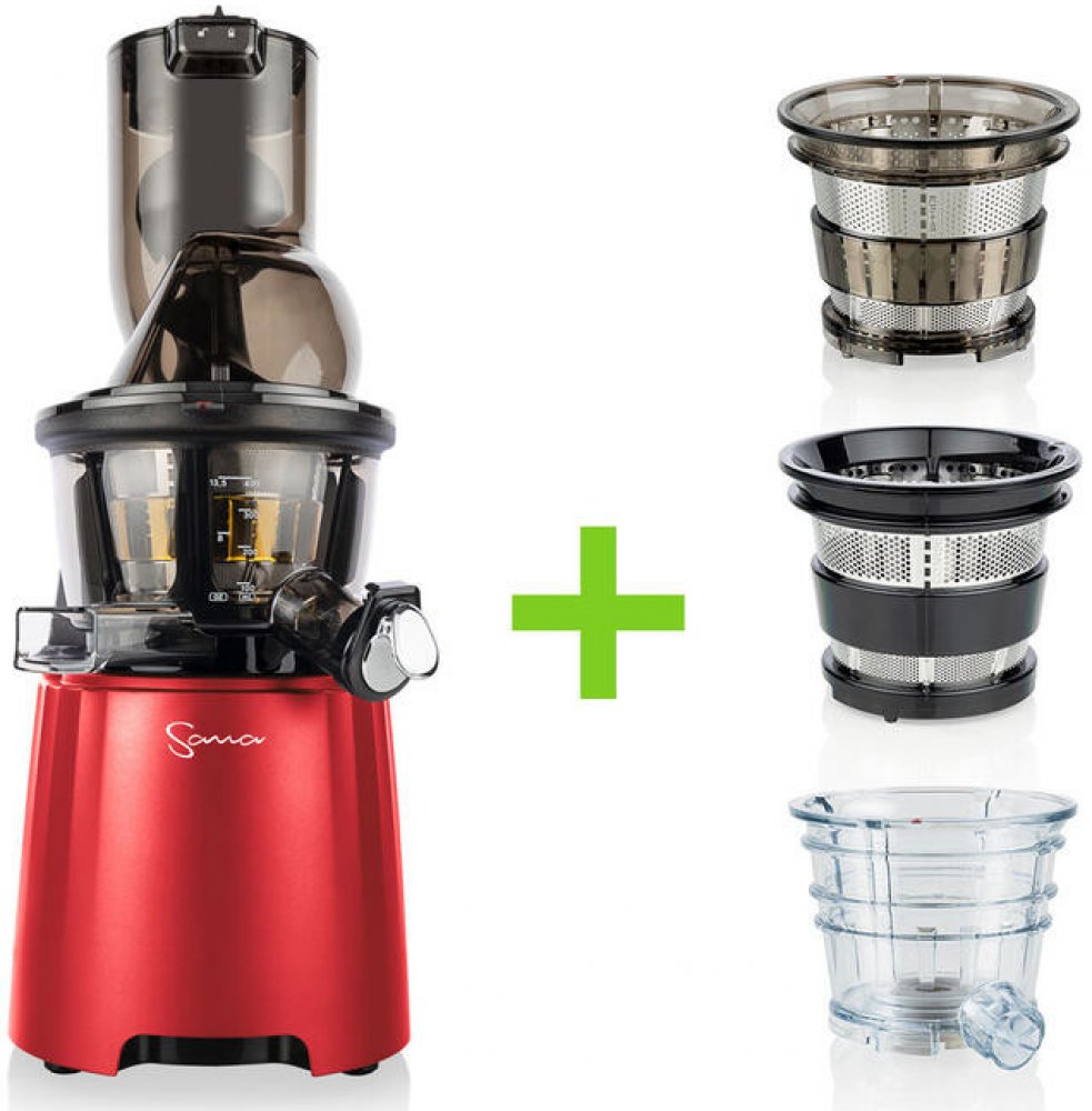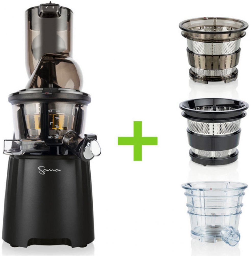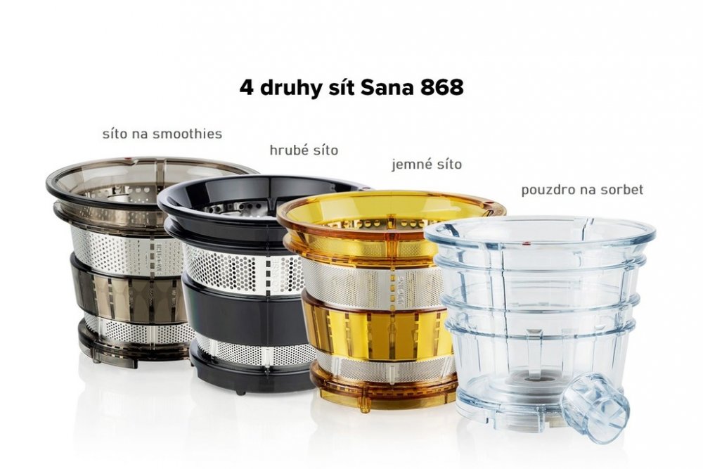 Vertikální odšťavňovač Sana 868 má velký plnicí otvor, do kterého se vejdou i celá menší jablka! Plnicí otvor je opatřený praktickým propadlem pro pohodlné vkládání surovin. Součástí balení jsou 4 druhy sít, která z něj dělají skutečně univerzální odšťavňovač. Zpracujete s ním mnoho druhů ovoce a zeleniny, připraví vám i sorbet z mraženého ovoce nebo smoothie. V balení najdete extra velkou skleněnou nádobu na šťávu 1500 ml, vyrobenou z tvrzeného borosilikátového skla a velkou nerezovou nádobu na odpad.