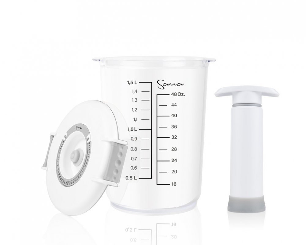 K vašemu odšťavňovači obdržíte praktickou vakuovou nádobu s objemem 1,5 litru, která je ideální pro uchování šťávy i na delší dobu. S přiloženou pumpičkou snadno a rychle odstraníte vzduch z nádoby, což výrazně zpomalí proces oxidace. Díky tomu zůstanou ve šťávě zachovány vitamíny a chuť až minimálně 24 hodin. Víko nádoby je vybaveno otočným kalendářem, pomocí kterého můžete pohodlně sledovat datum zavakuování.