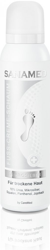SANAMED "Micro Silver", krémová pěna na nohy od CareMed je rychle se vstřebávající a vysoce kvalitní kombinace péče o suchou pokožku. Složky urea a glycerin vážou vlhkost v hlubších vrstvách pokožky. Mozoly se stanou pružnými a nadměrná novotvorba se sníží. SANAMED "Microsilver" má příjemnou jemnou vůni a poskytuje pokožce potřebnou péči. Zlepšuje strukturu pokožky bez narušení přirozené funkce pokožky. Pokožka získává výrazný jemný a hedvábný pocit.