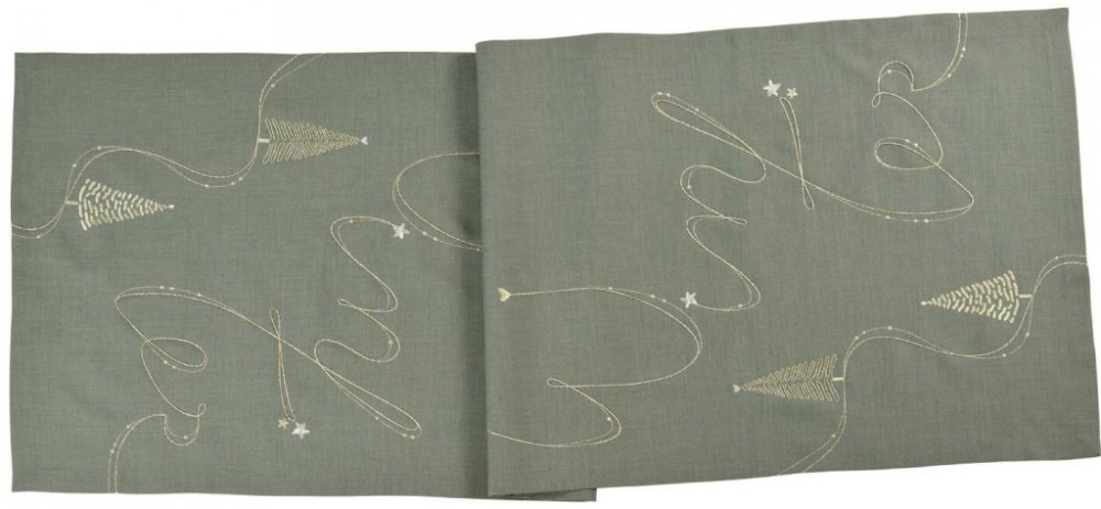 Běhoun na stůl se zlatou výšivkou a nešpinivou úpravou z kolekce It's Winter Loft německé značky Sander table+home v zelené barvě č. 32: jade. Šířka 50 cm, délka 150 cm.