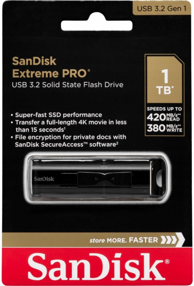 Ačkoliv je dnes cloudové úložiště běžně dostupné, nemusíte mít vždy možnost připojit se k internetu. V ten moment přichází v úvahu flash disk SanDisk. Poskytuje kapacitu 1000 GB, která uspokojí i nejnáročnější uživatele. Zajistí vám dostatek místa pro nejobjemnější data i 4K videa. Flash disk se k vašemu přístroji připojí prostřednictvím konektoru USB-A s rozhraním USB 3.2 Gen 1 (USB 3.0). Soubory ukládá rychlostí 380 MB/s. K uložení 15GB Full HD filmu budete potřebovat cca 3,5 minuty a k přenosu 1GB souboru postačí pouhých 15 vteřin. Při čtení souborů se rychlost pohybuje okolo 420 MB/s. USB flash disk SanDisk dotváří černá barva. Díky kompaktním rozměrům 11 × 21 × 71 mm (vך×d) jej snadno přemístíte kamkoliv s sebou. Hlavní přednosti flash disku SanDisk Extreme PRO 1TB Flash disk SanDisk funguje jako prostředek pro přesun souborů mezi různými zařízeními Poskytuje kapacitu 1000 GB Flash disk obsahuje konektor USB-A Rozhraní: USB 3.2 Gen 1 (USB 3.0) Při ukládání dat je k dispozici rychlost 380 MB/s...