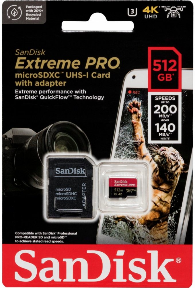 512 GB SanDisk microSD 200 MB/s 140 MB/s Class 10 UHS-I U3 V30 A2