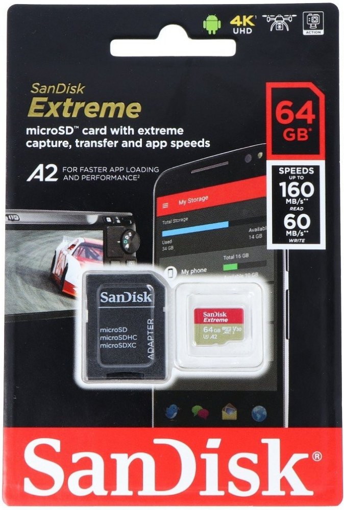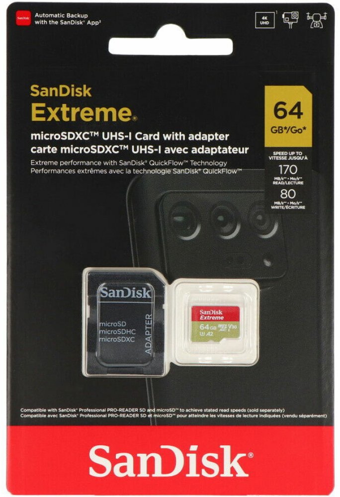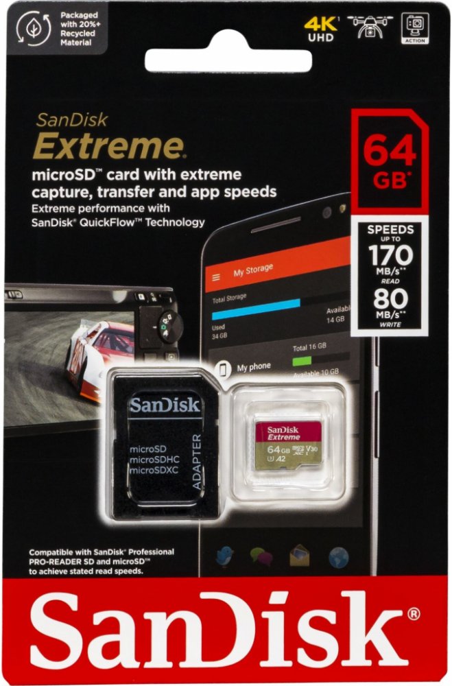 64 GB SanDisk microSD 170 MB/s 80 MB/s Class 10 UHS-I U3 V30 A2