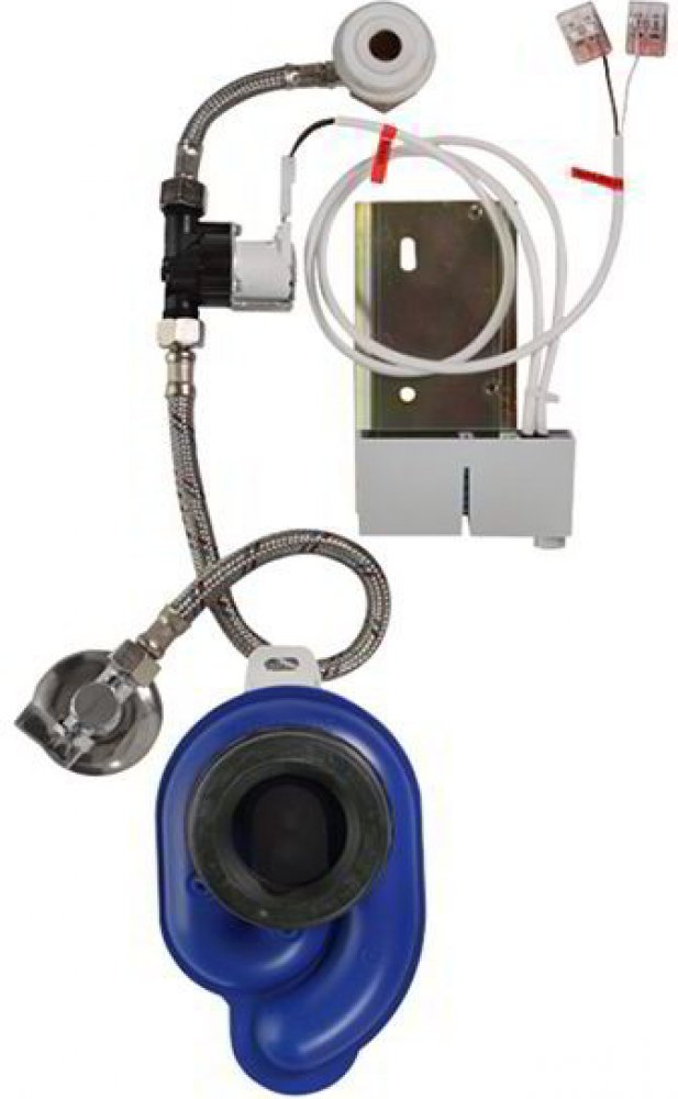 - radarový splachovač na montážní liště, elektromagnetický ventil, propojovací hadice, rohový ventil s filtrem a zpětnou klapkou, vtoková armatura s těsněním, sifon, montážní šablona