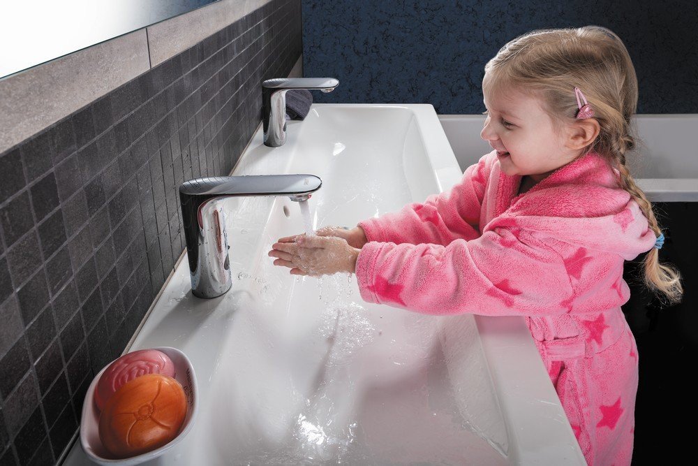- reaguje na přítomnost rukou ve snímané zóně okamžitým spuštěním vody