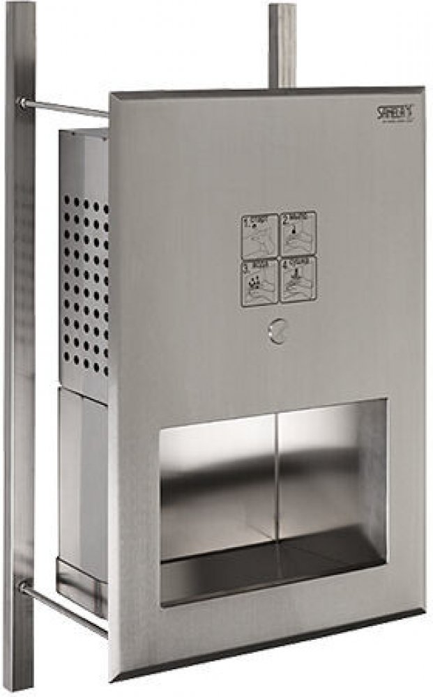 Nerezové antivandalové multifunkční umyvadlo, piezo systéme pro ovládání dávkovače mýdla, výtoku vody a osoušeče rukou v jednom, použití pro věznice, nastavení parametrů pomocí dálkového ovladače SLD 07, nástěnná montáž, montáž a servis z druhé strany stěny, povrch matný. 73701, SLUN70H_SAN