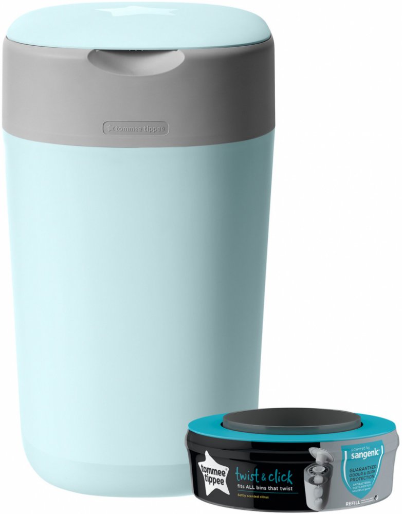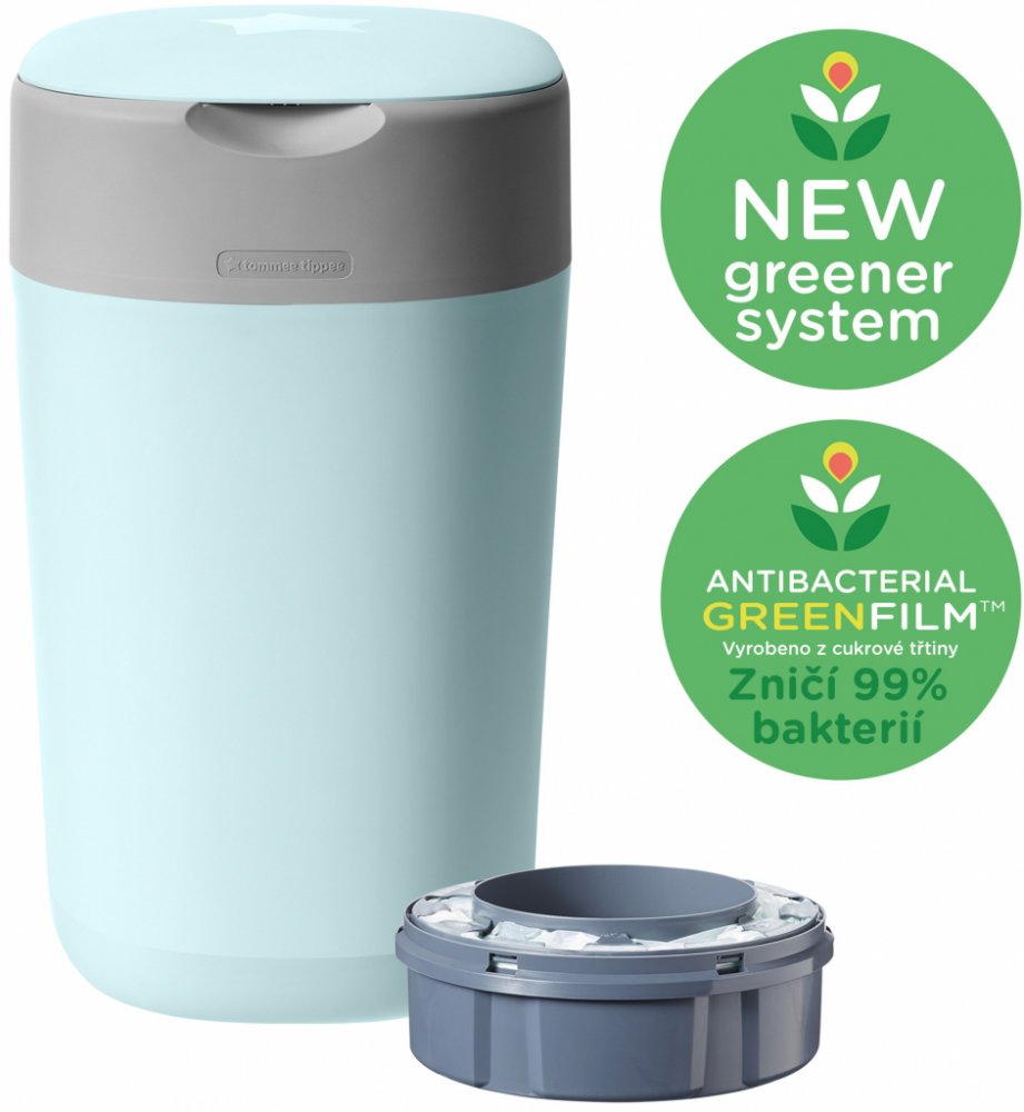 Nový, ekologičtější designový koš na jednorázové pleny Sangenic Twist & Click umožňuje bezdotykové zabalení použitých plen. Koš je vyroben z více než 98% z recyklovaného a recyklovatelného plastu. Výměnná kazeta, která je součástí koše, obsahuje 100% recyklovatelnou PE fólii GREENFILM™, vyrobenou z obnovitelného zdroje - cukrové třtiny.