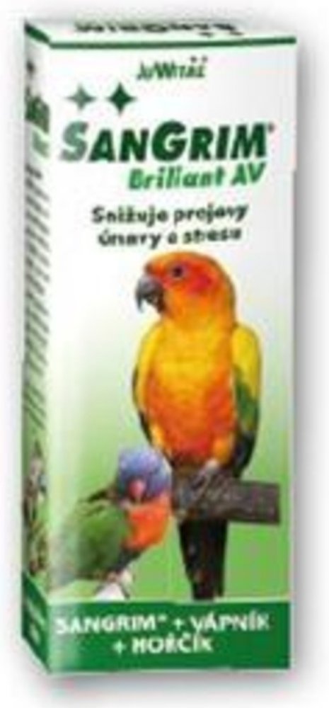 Doplněk stravy pro všechny druhy papoušků. Posiluje obranyschopnost, zvyšuje lesk a kvalitu peří, působí proti stresu, únavě a nemocem. Čistě přírodní přípravek Sangrim Briliant AV preventivně působí při zvýšené zátěži organismu, proti chorobám a zmírňuje jejich průběh. Pomáhá likvidovat plísňová onemocnění, odstraňuje únavu a vyčerpání, působí regeneračně.