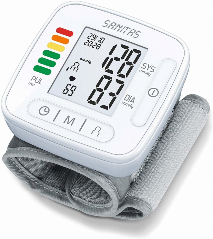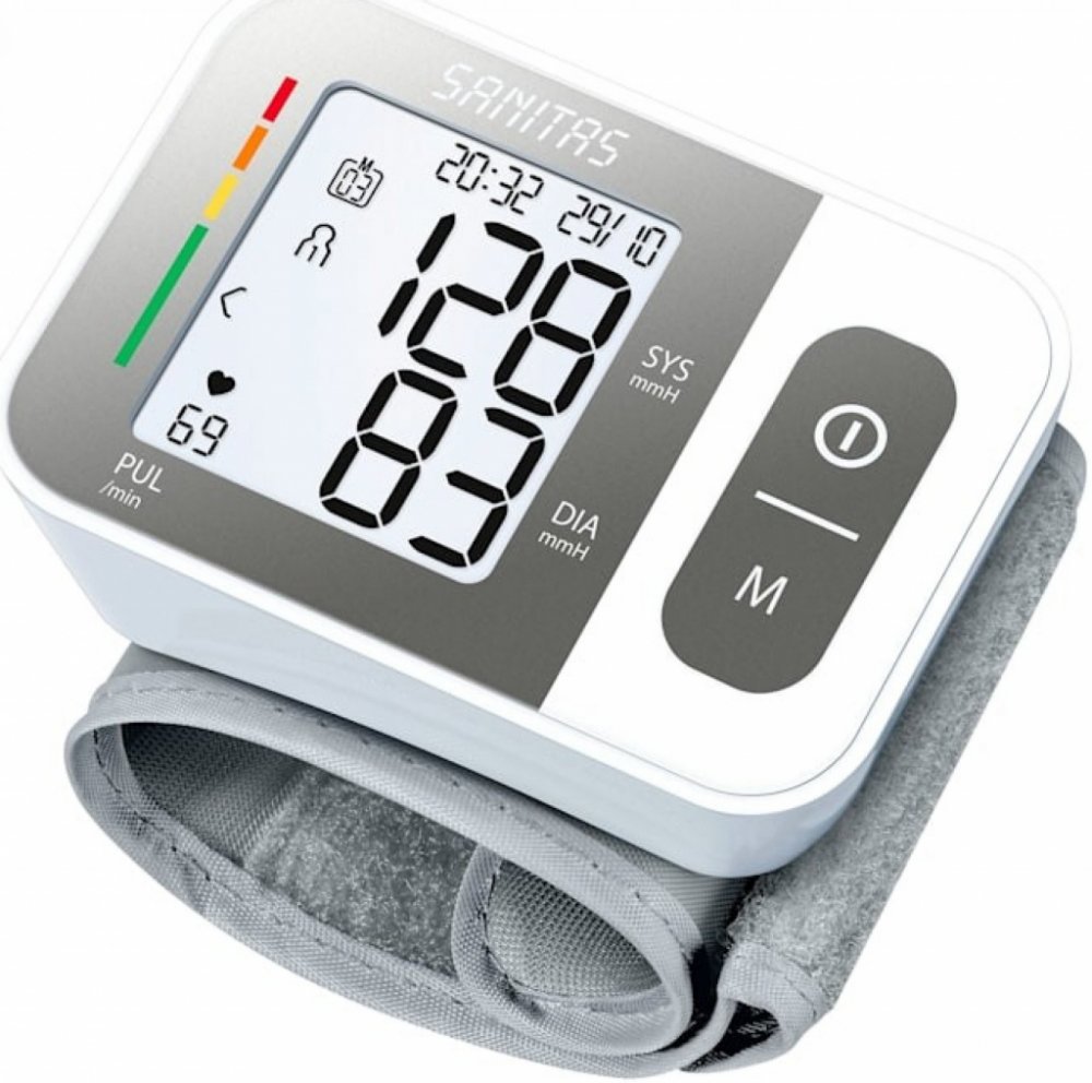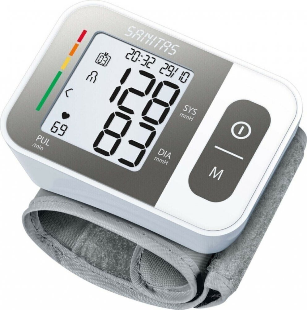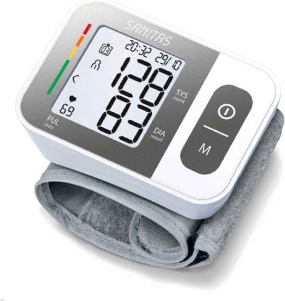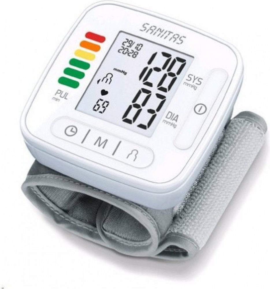 Sanitas bílá bateriové 60 měření na zápěstí pro cestování (na baterie) pro detekci arytmií/ECG pro páry (2 profily) oscilometrické automatické 239 g 60 x 29 x 84 mm pro malé paže integrovaná bez hadičky pouze lokální paměť