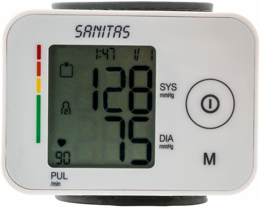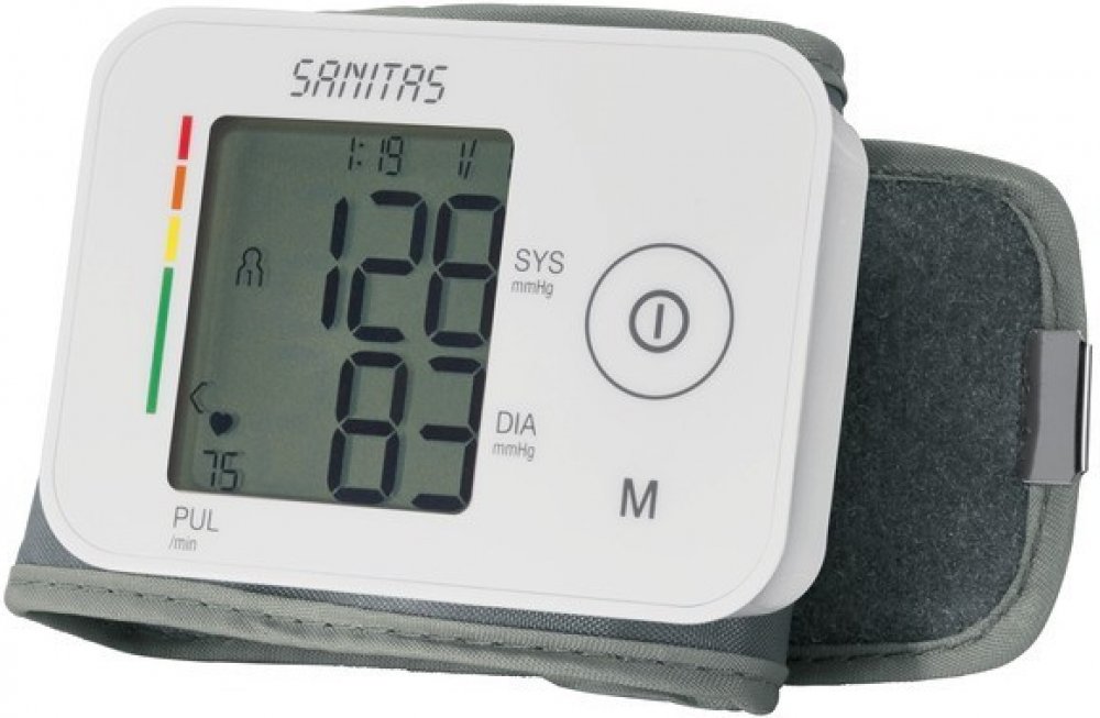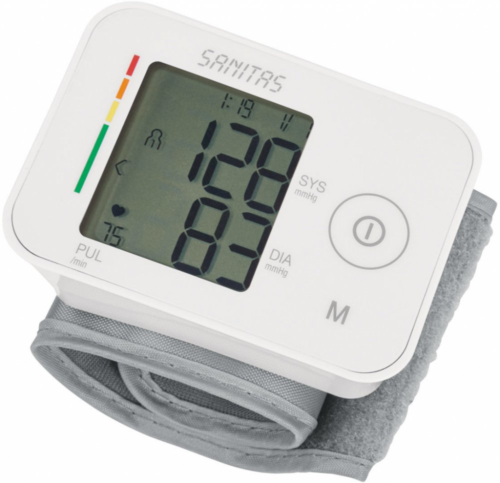 Sanitas bílá, šedá bateriové 120 měření na zápěstí pro cestování (na baterie) klinicky validované pro páry (2 profily) oscilometrické automatické pro malé paže integrovaná bez hadičky pouze lokální paměť