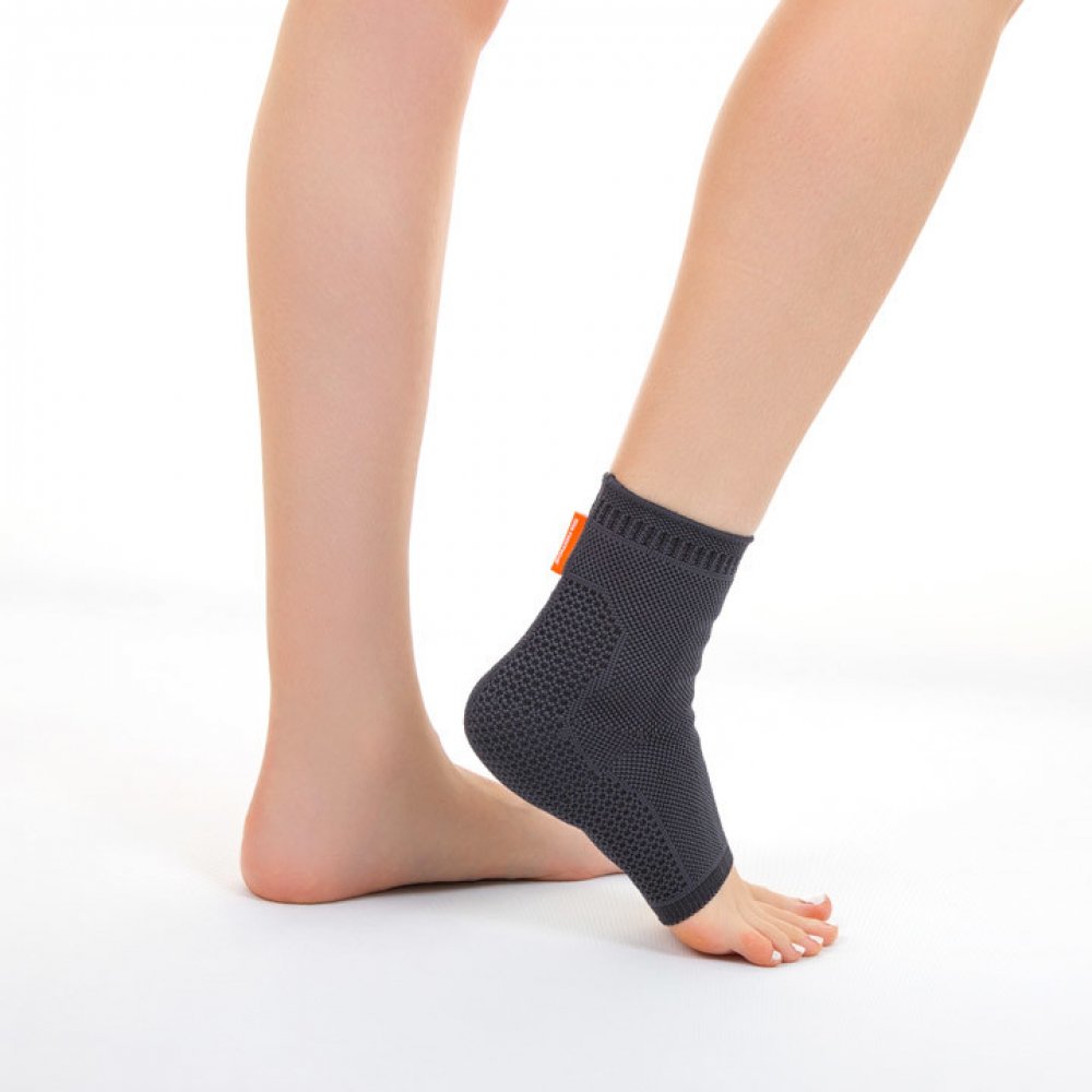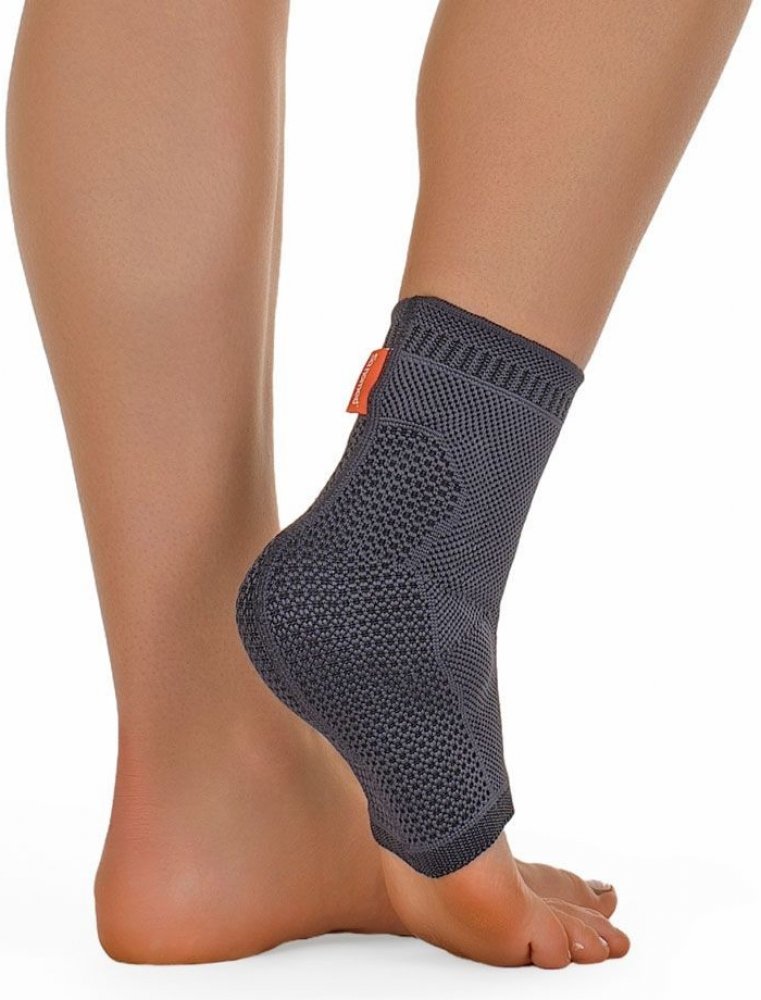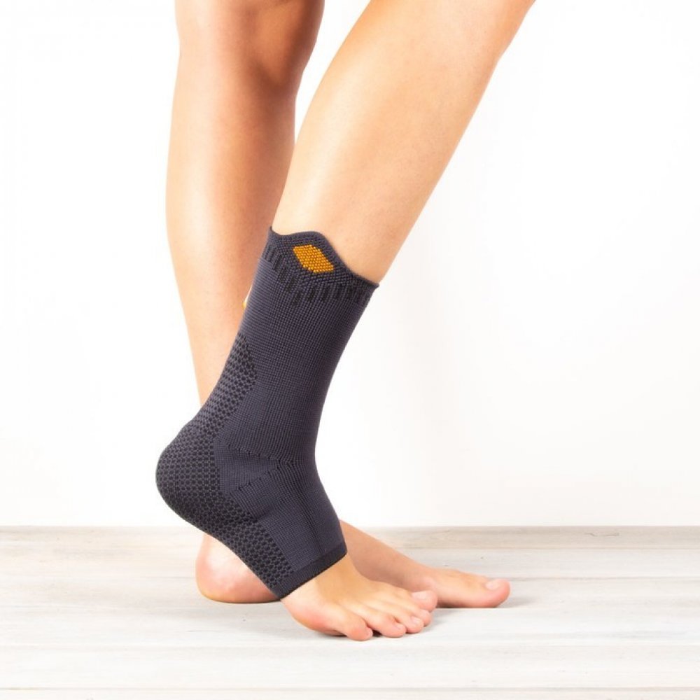 Bandáž hlezenního kloubu se silikonovými výztuhami. Hlezenní bandáž z kompresní pleteniny ve spojení se silikonovými polštářky, které masážním efektem urychlují absorpci hematomů a otoků. Profilované polštářky cíleným tlakem na měkké vazy, kloubní pouzdro a šlachy způsobují při chůzi rytmickou kompresi a tato zlepšuje prokrvení a napomáhá rychlé resorpci otoků a hematomů. Okraje bandáže se zmírněnou kompresí snižují tlak na lemu bandáže. Anatomicky tkaný úplet spolehlivě a rychle odvádí. Výsledek: kůže se tolik nezapotí a nošení pomůcky je pohodlné i v létě. Výhody: integrované silikonové peloty způsobující masážní efekt lem bandáže se sníženou kompresí navlékač pro pohodlné oblečení ortézy Indikace: lehké úrazy hlezna, lehké chronické nestability, otoky při artritidě nebo artróze, doléčení po operacích a úrazech hlezna Tabulka velikostí a měření velikost obvod nad kotníkem [cm] S 19-21 M 21-23 L 23-25 XL 25-27 XXL 27-29 Materiál: 70% Polyamid, 30% Elastan Praní a údržba: Perte ve vlažné vodě jemným pracím práškem v ruce, důkladně opláchněte a nechte usušit v místnosti bez mačkání. Nepoužívejte pračku nebo sušičku.