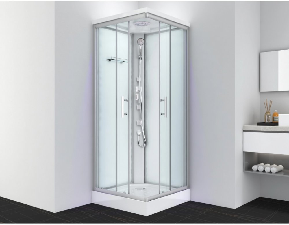 Kompletní sprchový kout do rohu ve tvaru čtverce s rozměry 80 x 80 x 215 cm. Se střechou. Parametry: - Posuvné dveře z bezpečnostního skla o síle 5 mm - Dvojitá kolečka - Hliníkové profily ve vzhledu chromu - Hlavová sprcha - Nastavitelná ruční sprcha - 3 masážní trysky - Skleněná police - Sprchová vanička (výška 14 cm) z ABS akrylátu