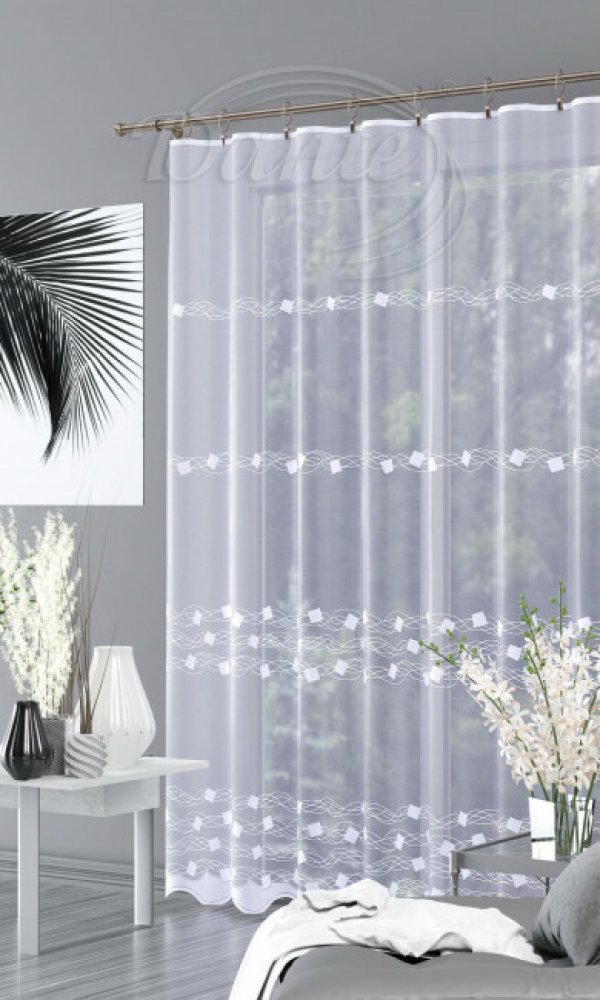 Záclonu ve výšce 250 cm zdobí dvě širší a dvě úzké bordury ve tvaru prolínajících se vlnek s kostičkami. Záclonu ve výšce 160 cm zdobí jedna široká bordura a dvě úzké.
