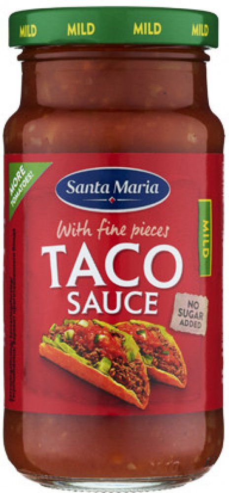 Santa Maria Taco sauce mild 230 g. Složení: rajčata (65 %)(drcená rajčata, rajčatové pyré, rajčatový protlak), voda, cibule, zelené chilli papričky, kvasný ocet lihový, kukuřičný škrob, jedlá sůl, koření a byliny (chilli papričky, česnek, kmín, koriandr, kayenský pepř, oregano). Skladujte v suchu a chraňte před teplem. Po otevření skladujte v chladničce a spotřebujte do 1-2 týdnů. Santa Maria Chunky wrap salsa je nově s ještě více rajčaty. Obsahuje méně cukru, méně soli a je bez modifikovného škrobu. Skvěle se hodí pro přípravu salsy k oblíbeným tortilla chips nebo k přípravě chutných wrapů. Země původu: Švédsko