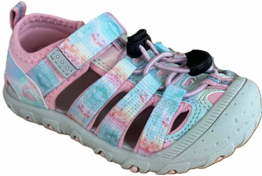 Dívčí sportovní sandály Santé. Obuv má pevný opatek a ohebnou podrážku. Zapínání na suchý zip, přes nárt možnost dotažení pomocí stahovací gumičky.