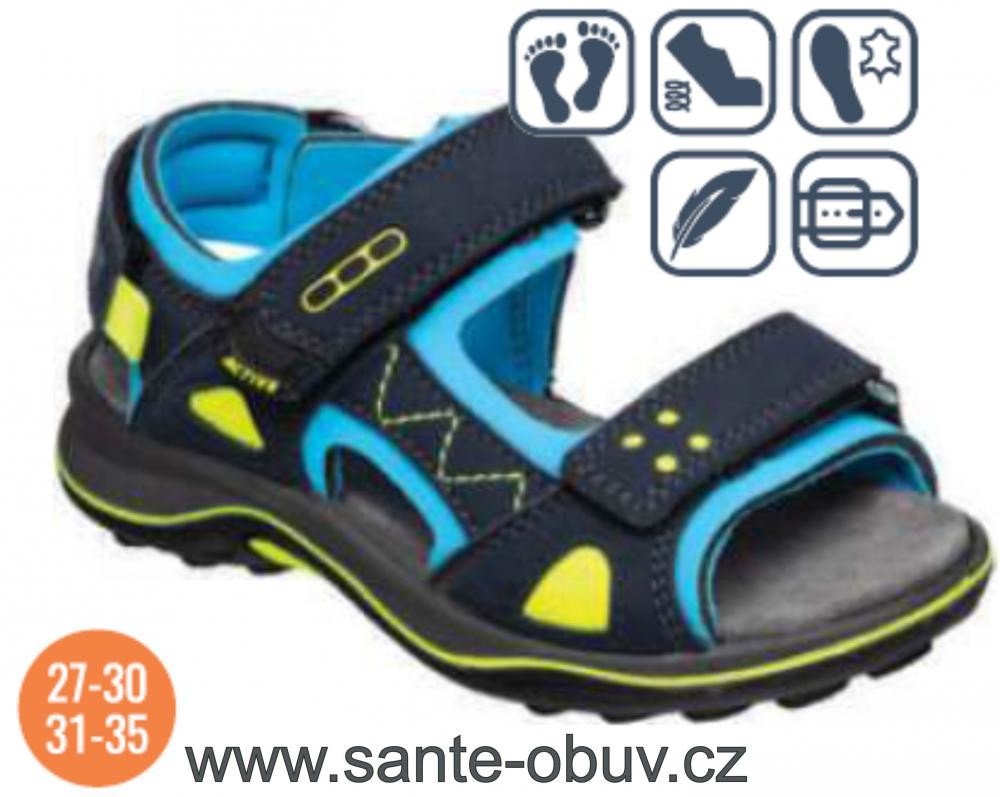 Kvalitní modré sandálky Santé. Botky jsou lehoučké, krásně ohebné, mají anti-šok systém (tlumí nárazy na patě). Zapínání na 3 suché zipy.