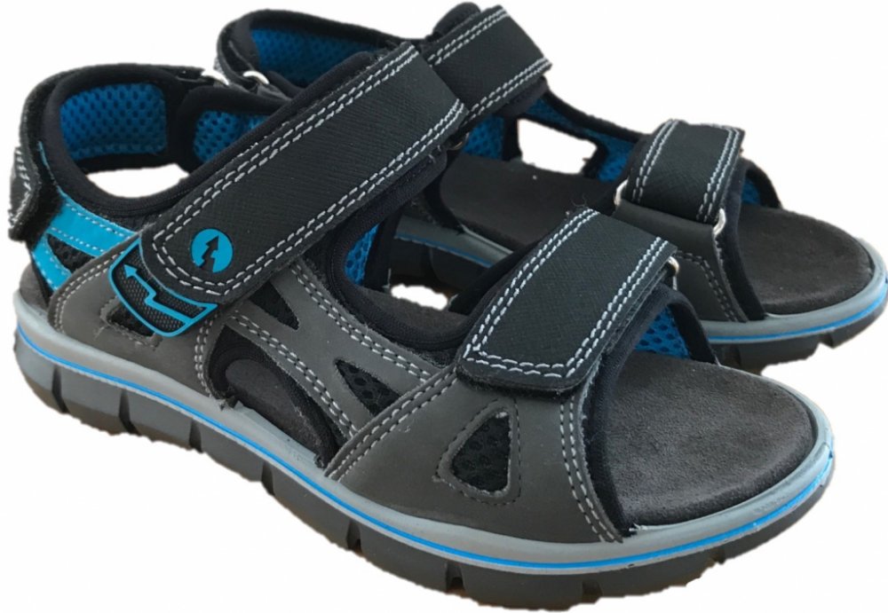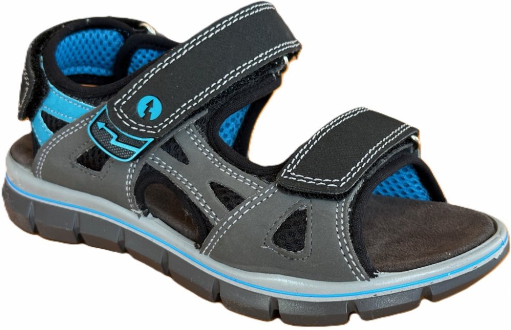 Krásné chlapecké sandály Santé s koženou stélkou. Botky jsou lehoučké, krásně ohebné, mají anti-šok systém (tlumí nárazy na patě). Zapínání na 3 suché zipy. Barva šedo-černo-tyrkysová.