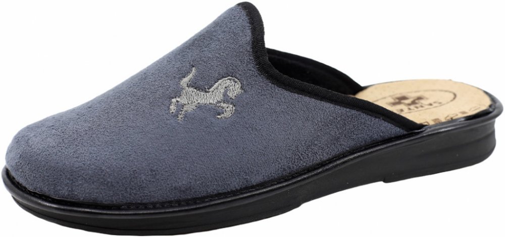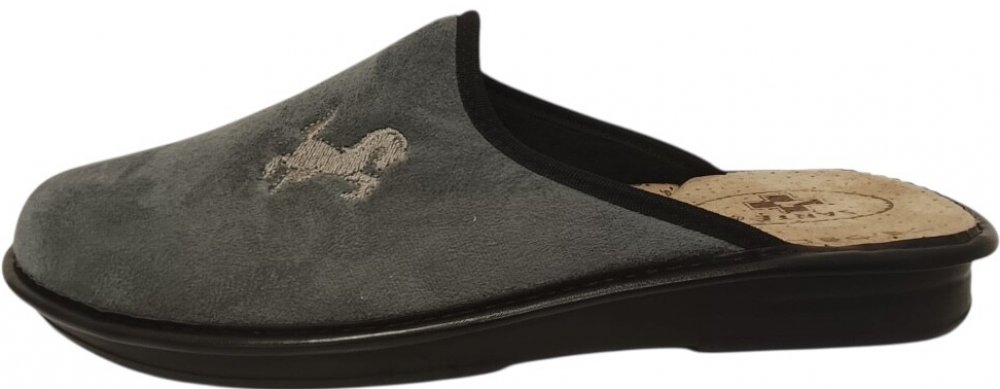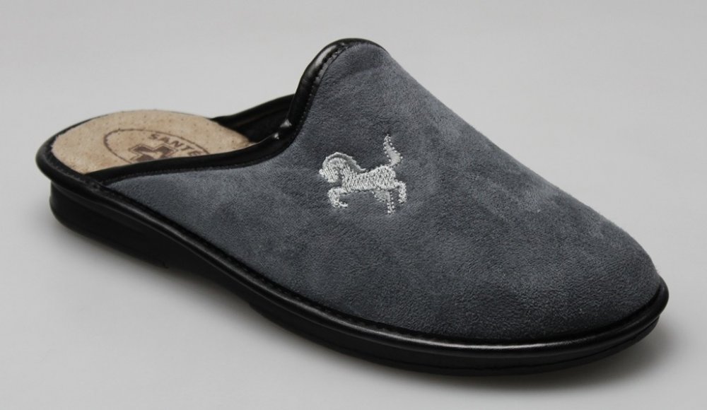 Pánský šedý domácí pantofel s vyšitým koněm, anatomicky tvarovaná stélka, prodyšný materiál, měkká, flexibilní, pohodlná obuv.