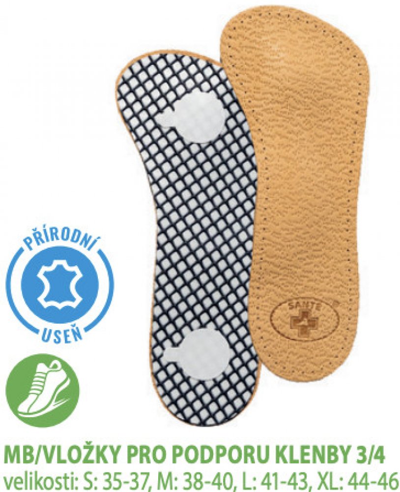 Ortopedicky tvarované 3/4 vložky s podporou příčné a podélné klenby jsou ideální pro obuv, kde není dostatek místa pro celou ortopedickou vložku. Povrch vložek je pokryt kvalitní ovčí usní, na kterou je upevněn měkký karbosanový výlisek, zajišťující podporu příčné a podélné klenby. Proti posunutí jsou vložky na spodní části opatřeny samolepicí vrstvou.